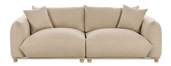 Pohovka v elegantní béžové barvě, která je čalouněna odolným polyesterovým materiálem, působí sofistikovaně a zároveň vám nabízí útulné a pohodlné místo k odpočinku. Krátké nohy z kaučukového dřeva poskytují stabilní základ a nechávají vyniknout hluboké a široké sedátko, které přímo láká k odpočinku. Extra polštáře stejné barvy doplňují vzhled pohovky a postarají se o pohodlí a luxusní zážitek z relaxace. Ponořte se do měkkých polštářů a na chvíli zapomeňte na starosti každodenního života.