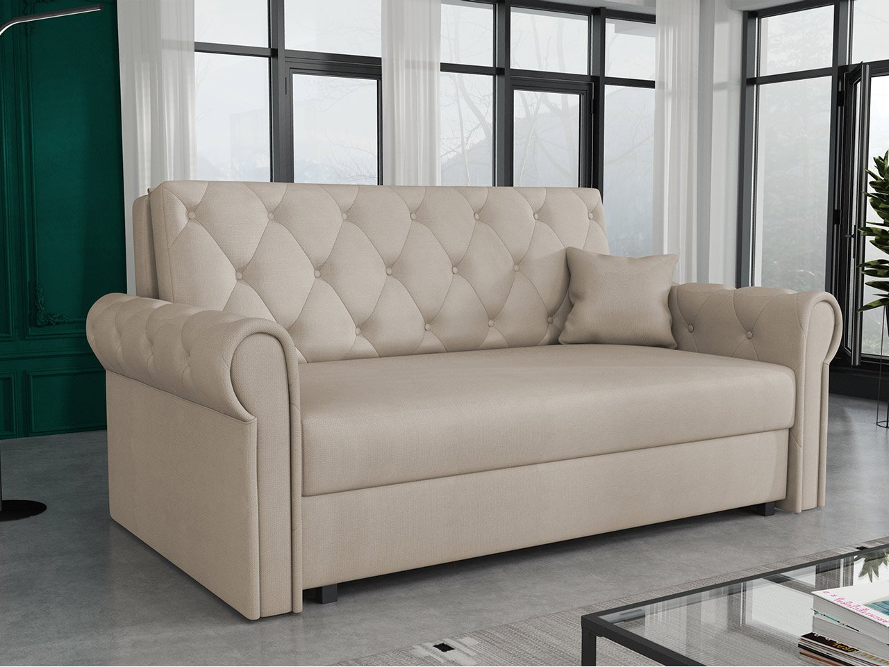 Chcete vytvořit módní relaxační prostor, kde se moderní trendy setkávají s pohodlím? Potom naše sedačka jistě splní všechna vaše očekávání! Rozkládací pohovka je nabídka vytvořená speciálně i pro ty nejnáročnější uživatele! Nábytek je vybaven sedadlem vyplněným vlnovými pružinami a pružnou polyuretanovou pěnou, které spolu s opěradlem plným polyuretanové pěny jemně obejme tělo uživatele a správně podpírá citlivé body páteře. Takto ani pár hodin strávených sledováním oblíbeného seriálu nebo odpoledním rozhrem s kamarádkou neskončí dotěrnou bolestí. Pohovka má funkci na spaní se snadno ovladatelným systémem DL, který umožňuje rychlou přeměnu na pohodlné lůžko s velkou plochou, jakož i prostorný lůžkový prostor, kde si můžete uložit potřebné textilie. Detaily produktu: hustota pěny: T35 metoda rozkladu DL, dekorační polštáře standardně, odnímatelné polštáře opěradla, pohovka je čalouněna snadno čistitelnou látkou Castel 03 ve světle béžové barvě, Castel je měkká, hladká látka vyznačující se vysokou odolností proti tření, odírání a ž čemuž skvěle funguje na každodenním nábytku. Další výhodou je Easy Clean Technology – materiál se snadno čistí, což umožňuje snadné odstranění nečistot s trochou vody a měkkým hadříkem.