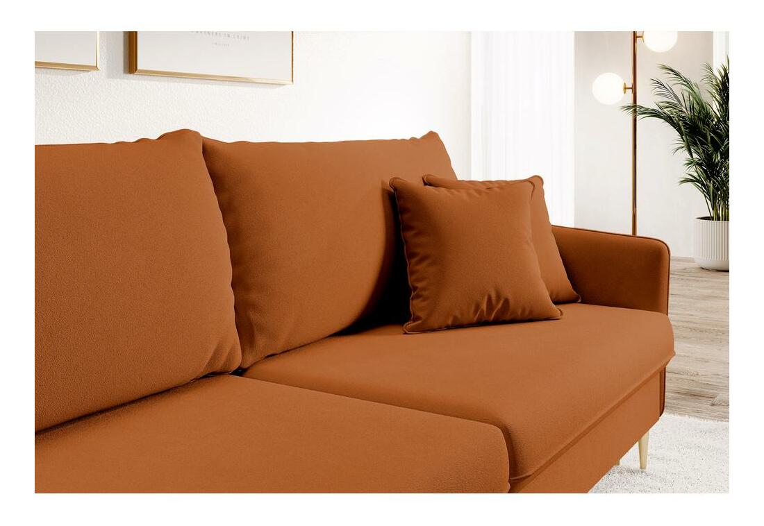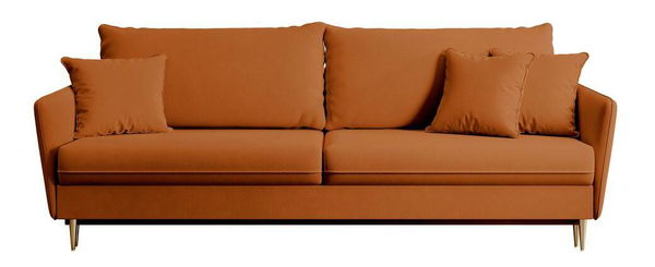 ZobrazitOceňujete subtilní nábytek, který potěší svojí nevtíravou elegancí? Potom je pohovka navržena právě pro vás Pohovka je nabídka, která vzbuzuje obdiv svou minimalistickou formou, ve které je jasně viditelná inspirace klasickými aranžérskými řešeními. Vysoké, téměř obdélníkové polštářky zádové opěrky dostatečně podepřou vaše záda a pohodlné opěradlo vám umožní zasloužený odpočinek. Povrch nábytku je vyplněn pěnou a vlnitými pružinami, takže je dostatečně měkký, aby bylo jeho používání mimořádně příjemné, a zároveň dostatečně pružný, aby nedocházelo k deformacím. Díky zabudované funkci spaní na základě praktického systému rozkladu DL snadno přeměníte kus nábytku na prostornou postel, kde můžete přespat hosty nebo zorganizovat setkání pro větší skupinu Podrobnosti o produktu: rám je vyroben z kombinace dřeva a dřevotřísky, díky které je konstrukce odolná vůči deformacím, sedátko vyplněné vlnitými pružinami a pěnou T3037 je pružné a po použití se rychle vrátí do původního tvaru, standardní kontejner na lůžkoviny, polštáře lze vyjmout, volně stojící model - má čalouněná záda, sada obsahuje dekorační polštáře, vejde se tři osoby, výška opěradla: 90 cm, šířka opěradla: 221 cm, výška područky: 64/75 cm, nábytek čalouněný látkou Magic Velvet 2286 v měděném odstínu Magic Velvet je stylový samet s jemným leskem. Odolný vůči tření, žmolkování a světlu. Waterproof Technology způsobuje, že kapalina kondenzuje na povrchu materiálu ve formě kapek Animal-friendly Technology, která je zodpovědná za zvýšenou odolnost látky zpomalující hoření.