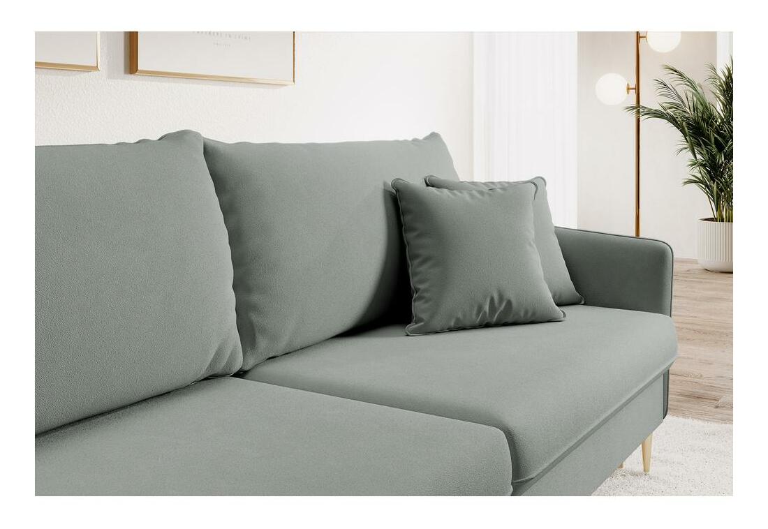 ZobrazitOceňujete subtilní nábytek, který potěší svojí nevtíravou elegancí? Potom je pohovka navržena právě pro vás! Sedačka je návrhem, který vzbuzuje obdiv svojí minimalistickou formou, ve které je jasně viditelná inspirace klasickými aranžérskými řešeními. Vysoké, téměř obdélníkové polštářky zádové opěrky dostatečně podepřou vaše záda a pohodlné opěradlo vám umožní zasloužený odpočinek. Povrch nábytku je vyplněn pěnou a vlnitými pružinami, takže je dostatečně měkký, aby bylo jeho používání mimořádně příjemné, a zároveň dostatečně pružný, aby nedocházelo k deformacím. Díky vestavěné funkci spánku založené na praktickém rozkládacím systému DL můžete nábytek jednoduše přeměnit na prostornou postel, kde můžete přespat hosty nebo zorganizovat schůzku pro větší skupinu. Detaily produktu: rám je vyroben z kombinace dřeva a dřevotřísky, díky čemuž je konstrukce odolná vůči deformaci, sedák vyplněný vlnovými pružinami a pěnou T3037 je pružný a po použití se rychle vrátí do původního tvaru, standardem je kontejner na lůžkoviny, polštáře lze odebrat, model volně stojící - má čalouněná záda, sada obsahuje dekorační polštáře, pojme tři lidi, výška opěradla: 90 cm, šířka opěradla: 221 cm, výška područky: 64/75 cm, nábytek čalouněný Magic Látka Velvet 2217 v odstínu šedé Magic Velvet je stylový samet s jemným leskem. Odolný vůči tření, žmolkování a světlu. Waterproof Technology způsobuje, že kapalina kondenzuje na povrchu materiálu ve formě kapek. Za zvýšenou odolnost vůči aktivitě zvířat je zodpovědná technologie šetrná ke zvířatům. Tkanina zpomalující hoření.