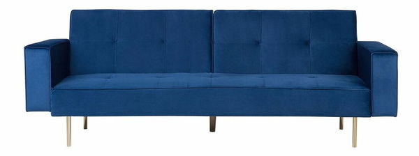 Elegantní pohovka čalouněná jemným polyesterovým sametem v modrém odstínu krásně doplní interiéry v moderním, minimalistickém nebo glamour stylu. Má pevnou dřevěnou konstrukci a hrubou výztuž z nadýchané pěny pro maximální pohodlí při sezení. Jemné čalounění, ozdobné prošívání a lesklé kovové nohy dodávají pohovce okouzlující vzhled, který dokonale kontrastuje s jednoduchým designem. Pohovka se dá změnit na pohodlnou postel pro dvě osoby, což oceníte zejména tehdy, když k vám přijdou hosté.