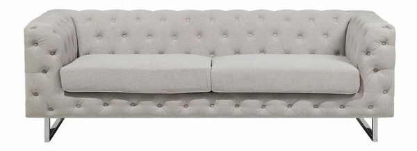 Vylepšete svůj obývací prostor a dodejte mu půvab s touto třímístnou čalouněnou pohovkou. Její elegantní design, který je inspirován stylem Chesterfield v kombinaci se stylem tuxedo, se hodí do každého moderního, ale i tradičně zařízeného interiéru. Pohovka s kvalitním béžovým čalouněním má nohy z nerezavějící oceli, tlusté sedací polštáře pro lepší komfort a výrazné prošívání s knoflíky.