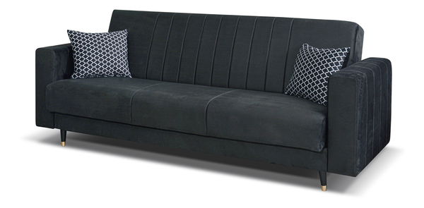 Tmavě šedý odstín je nadčasový a snadno se kombinuje s různými styly interiéru – od minimalistického, přes skandinávský až po industriální. Dva malé vzorované polštáře v ceně dodávají pohovce šmrnc a zároveň zvyšují komfort. praktický nábytek do obývacího pokoje, který spojuje moderní design s funkčními vlastnostmi.