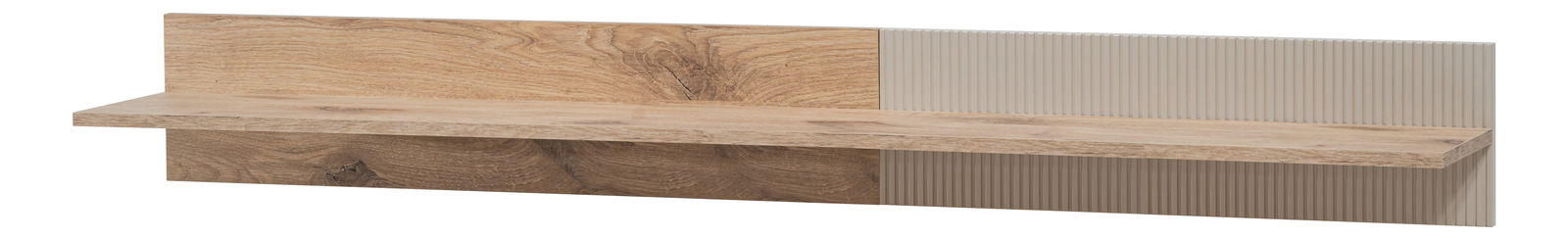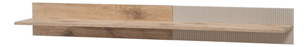 Nástěnná police je ideálním doplňkem vašeho obývacího pokoje, který v sobě spojuje jednoduchost a design. Díky čistému tvaru a kombinaci dekorů dub viking a kašmír s jemným drážkováním působí moderně a zároveň příjemně hřejivě. Skvěle se hodí k vystavení knih, dekorací, fotografií nebo rostlin. Police navazuje na design ostatních prvků sady, čímž vytváří vizuálně jednotný a harmonický interiér.