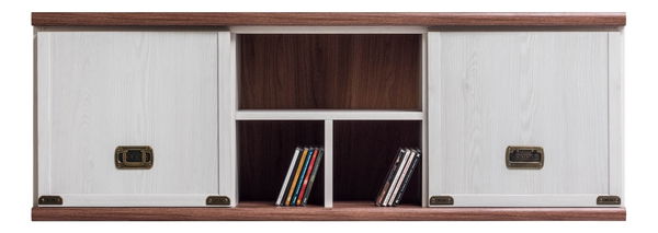 Stylová dvoubarevná závěsná polička na stěnu. Po stranách poličky jsou skříňky, uprostřed se nacházejí poličky. Zajímavé drobné kulaté úchyty na dvířkách a zásuvce v provedení dub příjemně osvěží světlé provedení. Horní deska a spodní díl skříňky je v provedení dub.