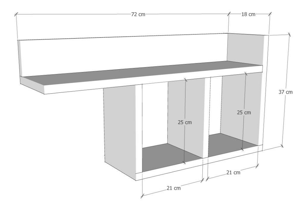 tloušťka: 18 mm, šířka: 72 cm, výška: 37 cm, hloubka: 18 cm, šířka spodní police: 42 cm, výška police: 25 cm