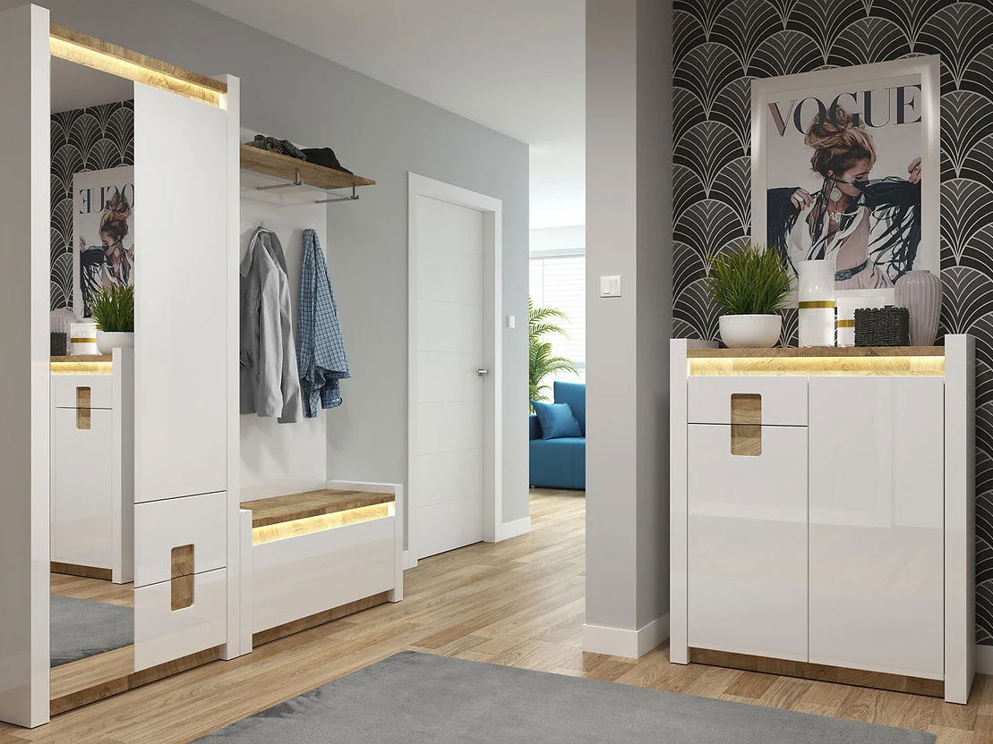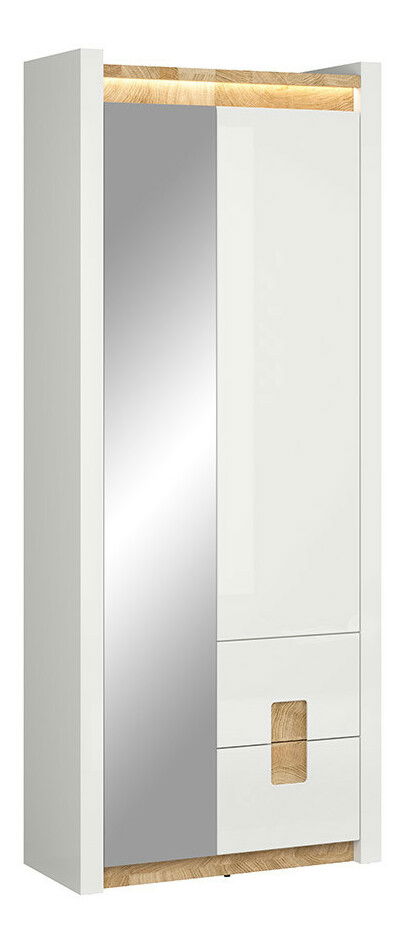 Dvoudveřová šatní skříň moderního dizajnu se zrcadlovými dvířky a dvěma praktickými zásuvkami. Uvnitř disponuje třemi velkými policemi a 1 malou. Barevná kombinace bílého lesku s prvky dubu westminster působí elegantně a neutrálně. Levé zrcadlové dveře dokonale prosvítí celý interér, díky čemuž bude působit svěže a přírodně. Materiál: Nábytková doska. Nábytok disponuje bezúchytovým otváraním dvierok a pri objednať si môžte LED osvetlenie.
