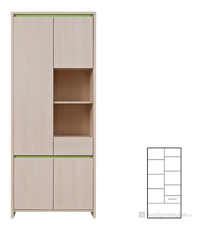 Čtyřdveřová skříň s otevřeným policovým prostorem.
