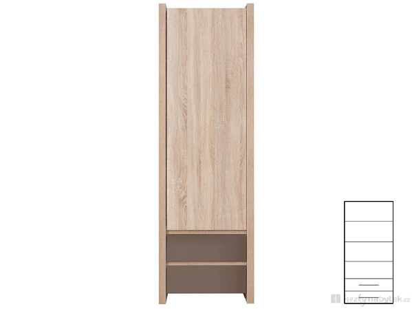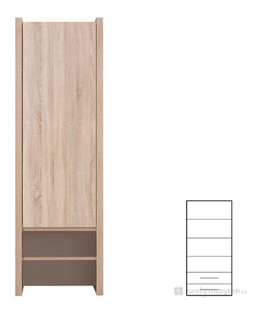 Velmi pěkná policová skříň REG1D2S série Venom mix renomované značky BRW Vám poskytne 3 poličky za plnými dřevěnými dvířky a 2 zásuvky ve spodní části.Skříň poskytuje díky své výšce a 202,5cm dostatek úložného prostoru pro Vaše věci. Skříň je navržena v pěkném moderním designu a k dispozici je v barevném provedení dubového dřeva a spodní zásuvky mají barvu šedou nebo bílou, dle Vašeho přání.
