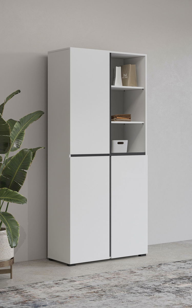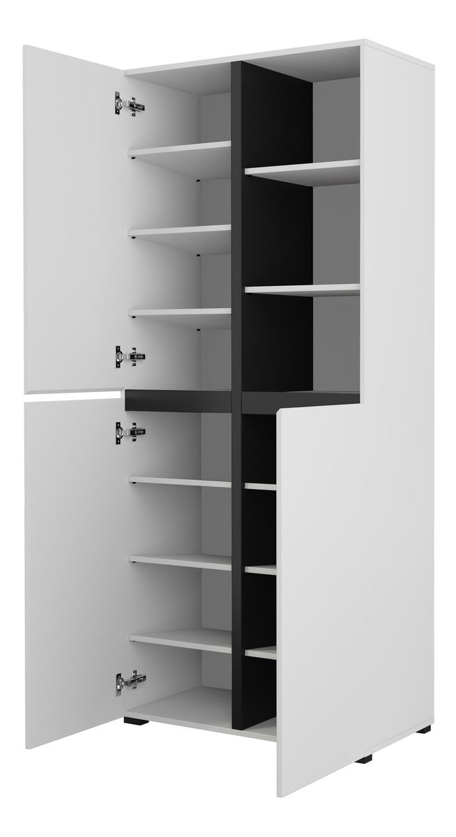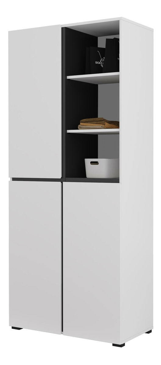 Elegantná skriňa, poličky na oblečenie sú v miernom sklone pre istotu aby nevypadli von. Nožičky som nepoužila, aspoň sa nepráši pod skriňou.