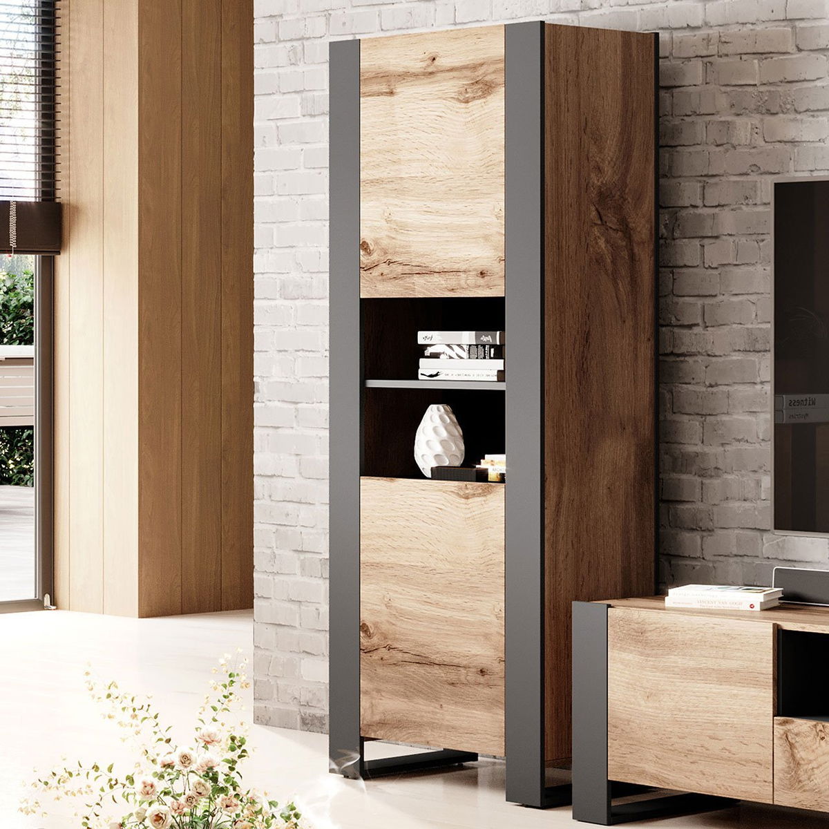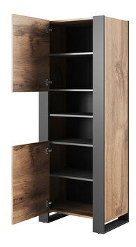 ZobrazitModerní policová skříň Empora najde uplatnění v obýváku, ložnici nebo domácí pracovně. Konstrukce nabízí dvě skříňky s plným čelem, což umožňuje uložení bytových doplňků, dokumentů nebo oblečení. Ve středu jsou otevřeny police, které umožňují vystavit oblíbené knihy, fotografie nebo suvenýry z dovolené. Skříň byla vyrobena z vysoce kvalitních komponentů. Korpus a čela mají barvu přírodního dřeva v matném provedení. Rám, který nahrazuje tradiční nohy, je dostupný v antracitové barvě. Skříň nemá tradiční úchytky, nahradily je mírně vystupující čela, což se promítá do moderního vzhledu nábytku.