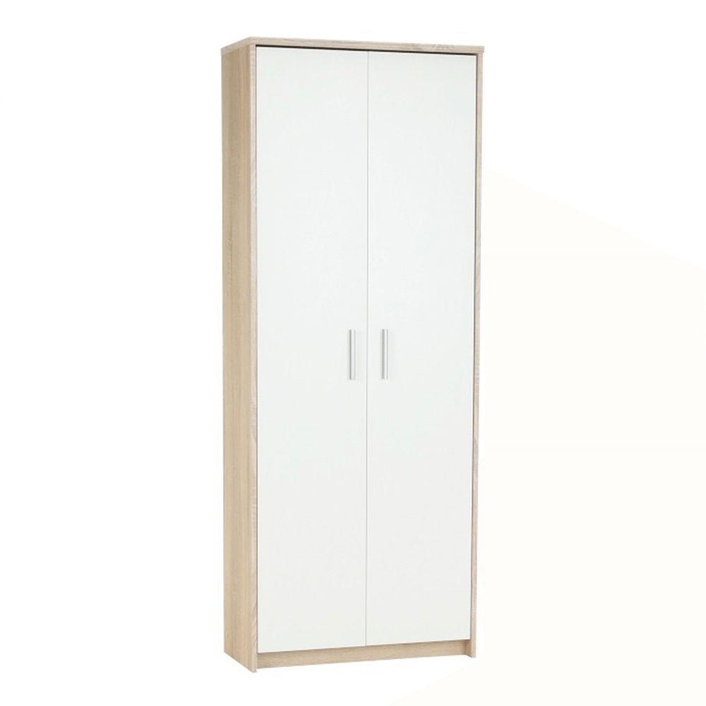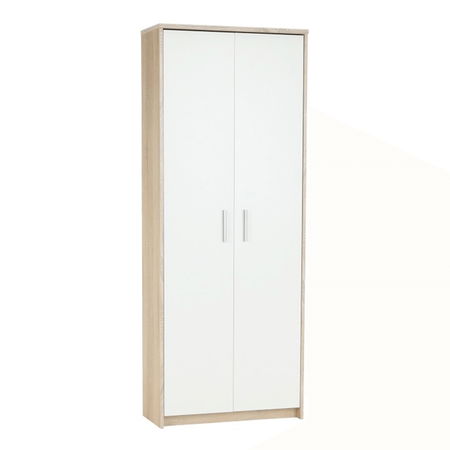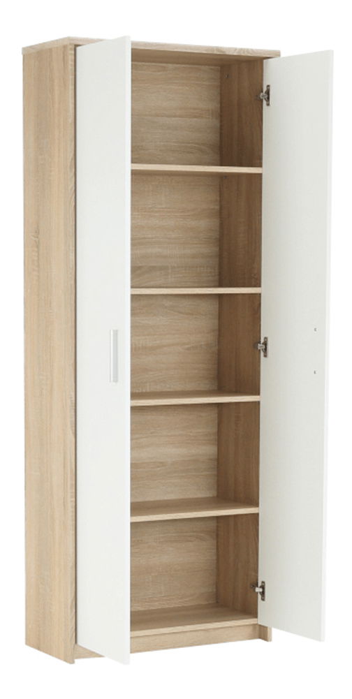 Skříň Jove Typ 05 výška 186 cm hloubka 33,5 cm Dub Sonoma + Bílá je dvoudveřová skříň se čtyřmi poličkami vyrobená z laminované DTD. Vnitřní úložný prostor se pohybuje od 32 cm – 34,7 cm výšky. Tloušťka materiálu je 16 -22 mm. Tato univerzální kancelářská sestava zahrnuje sedm prvků, které vám postačují pro kompletní zařízení kanceláře. Sektorový nábytek Johan v atraktivním barevném provedení dřeva dub sonoma v kombinaci s bílou. Technické parametry jsou: s dvířky, barevné provedení dub sonoma/bílá, materiál DTD laminovaná/ABS hrany, rozměry (ŠxHxV) jsou 72,5x33,8x186 cm. Tloušťka materiálu je 16/22 mm. Tento policový slovenský výrobek se dodává v demontu.