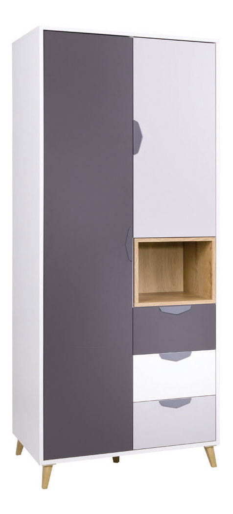 - Policová skříň Juna 2 (bílá + grafit + šedá + dub lefkas)