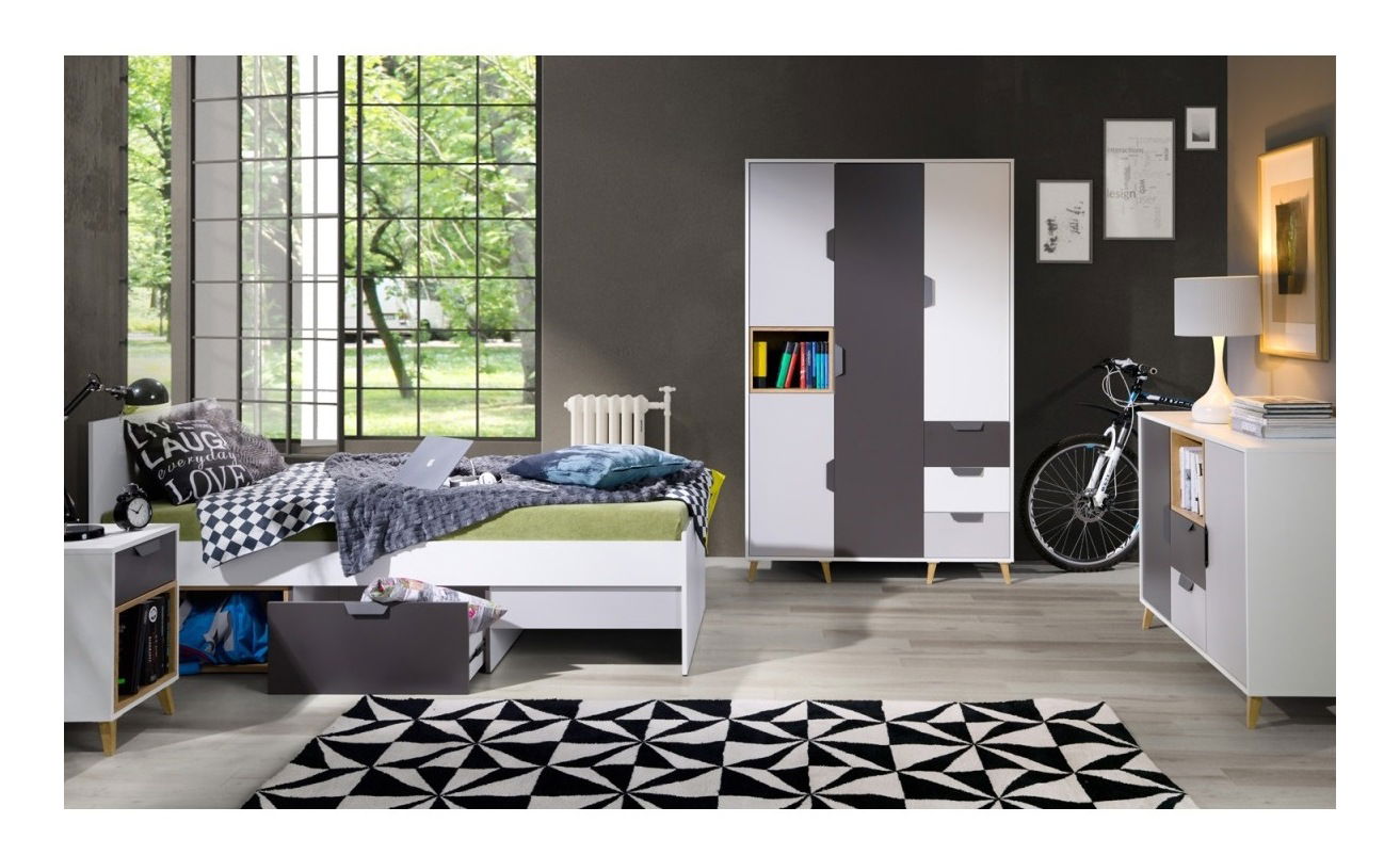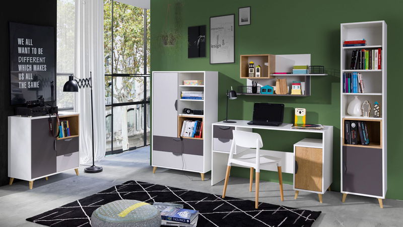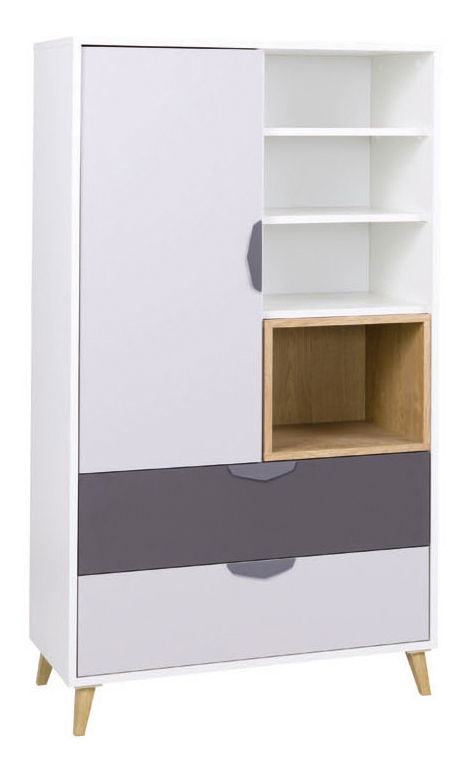- Policová skříň Juna 5 (bílá + grafit + šedá + dub lefkas)