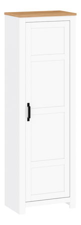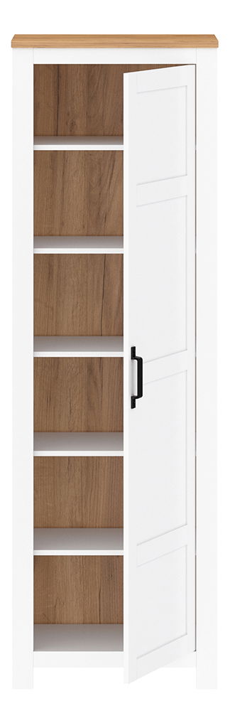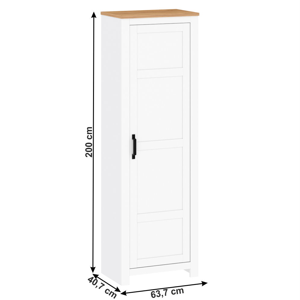 Policová skříň Lanuelle V o výšce 200 cm a hloubce 40,7 cm je ideální volbou pro ty, kteří hledají stylový a praktický nábytek do svého interiéru. Je vyrobena z DTD laminovaného materiálu s ABS hranami a je k dispozici v bílém albínu nebo dubovém provedení se zlatými detaily. Korpus skříně je tloušťky 16 mm, vrchní deska 22 mm a dveře mají 19 mm. Spodní prostor od podlahy má výšku 7,2 cm. Skříň má rozměry 63,7x40,7x200 cm a je dodávána v demontu s ozdobným úchytem. Svým elegantním designem a dostatečným prostorem pro uskladnění věcí je ideální pro každý domov.