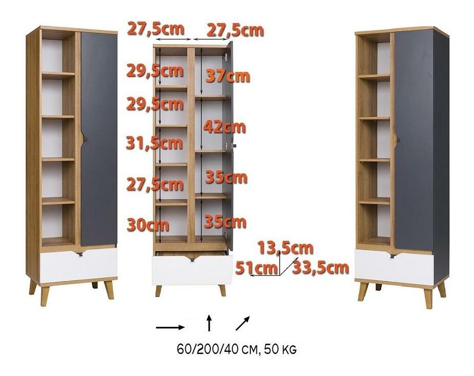 Policová skříň Mimone R1D1SZ (dub zlatý + bílá matná + grafit) o výšce 200 cm a hloubce 40 cm je ideálním řešením pro vaše úložné potřeby. Skříň kombinuje moderní design s vysokou funkčností. Je vyrobena z kvalitního materiálu a má ABS hrany. Skříň je vybavena kovovými úchyty, lištami a plastovými nohama. Rozměry balíku č.1 jsou 183,5x41x7 cm/30 kg a rozměry balíku č.2 jsou 71x43x14,5 cm/20 kg. Ve dvířkách jsou vložky, které dodávají skříni elegantní vzhled a zároveň chrání její obsah před prachem a nečistotami. Tato skříň je skvělou volbou pro ty, kteří hledají kvalitní a praktická řešení pro své domácnosti.