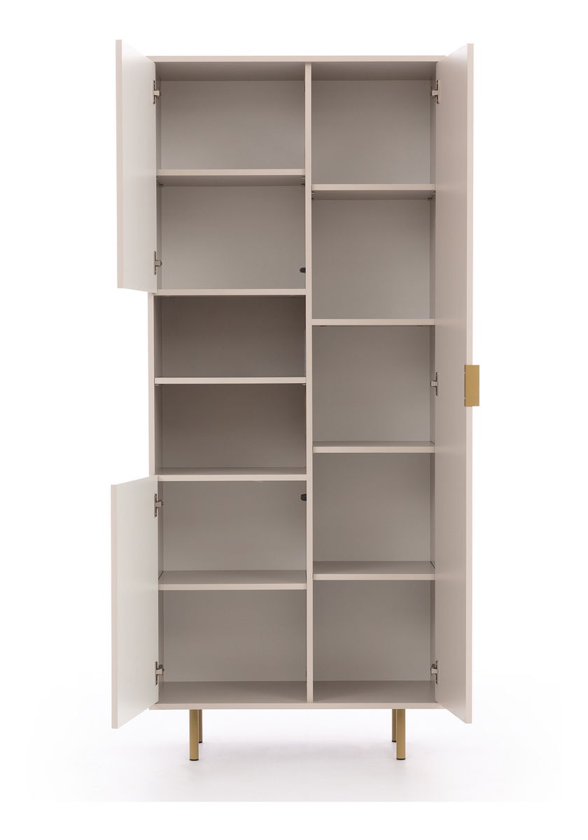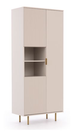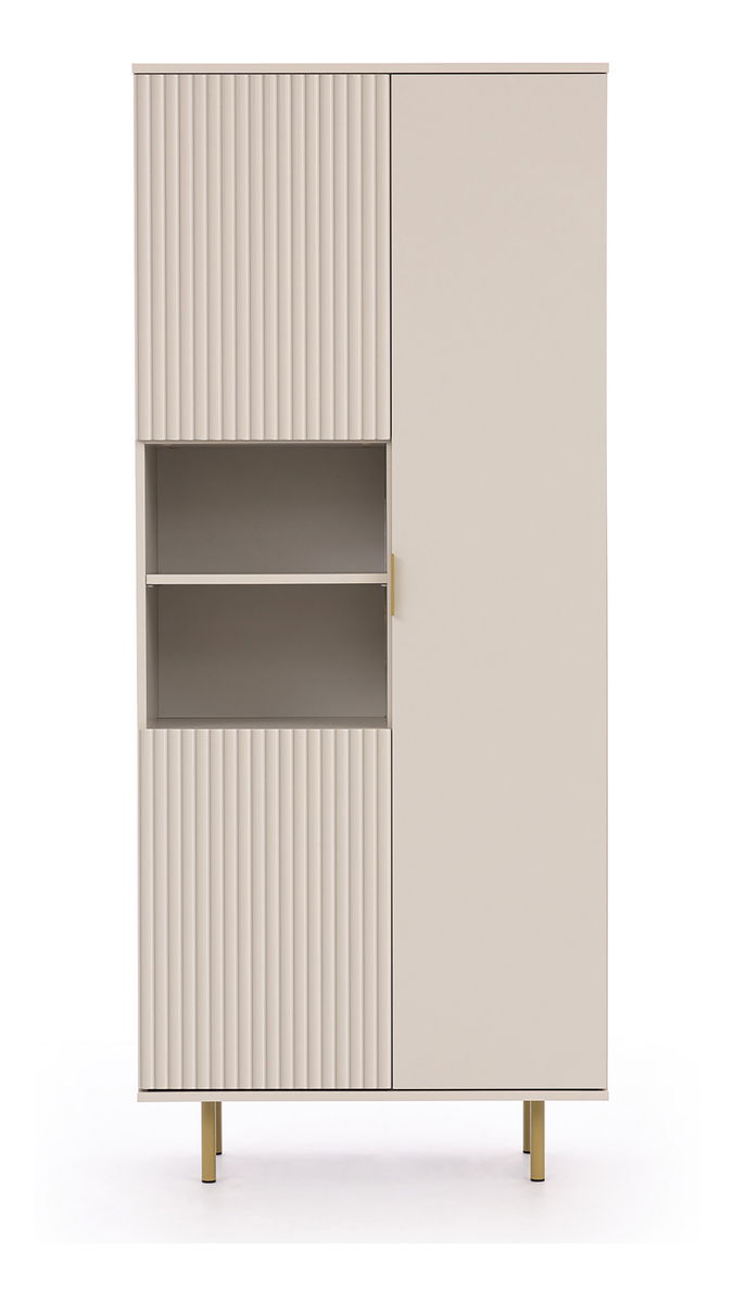 Vysoká policová skříň Nalani R3D (kašmírová) o výšce 190 cm, šířce 80 cm a hloubce 41 cm je praktickým a vizuálně přitažlivým doplňkem do každé místnosti. Skříň je vyrobena z odolné 16 mm dřevotřísky s pevnou 3 mm HDF deskou na zadní straně, což zajišťuje její dlouhodobou stabilitu a pevnost. ABS hrany zvyšují odolnost proti oděru a poškození, což je důležité pro každodenní používání. Dvířka jsou frézována bez úchytu, což dodává skříni moderní a čistý vzhled. Nožičky z kovu ve zlaté barvě dodávají nábytku styl a umožňují snadné čištění prostoru pod skříní. Kovové úchyty ve zlaté barvě jsou nenápadné a zároveň elegantní. Systém otevírání dveří „push to open“ umožňuje snadné otevírání s minimálním úsilím. Skříň má devět poliček, které poskytují spoustu úložného prostoru pro knihy, dekorace, dokumenty a jiné předměty. Je to nábytek, který kombinuje funkčnost s estetickou přitažlivostí a je vhodný do stylových kanceláří, obývacích pokojů nebo studií.