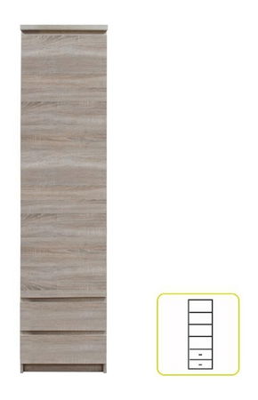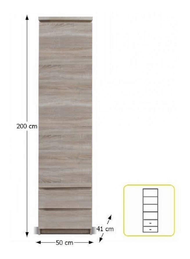 ZobrazitPolicová skříň Punkto Typ 02 1D2S výška 200 cm hloubka 41 cm Dub Sonoma je skříň se dveřmi a dvěma šuplíky na spodku. Tento nábytek z řady Panama dodává Vašemu obývacímu pokoji stylový vzhled. Barevná kombinace dubu sonoma s moderním bezúchytovým otevíráním dodává pokoji pocit luxusu. Materiál DTD laminovaná a každý díl je vybaven ABS hranami, což zaručuje dlouhou životnost nábytku. Tato policová skříň má rozměry 50 x 41 x 200 cm. Korpus má tloušťku 16 mm a vrchní deska 25 mm. Nábytek se dodává v demontu.