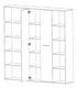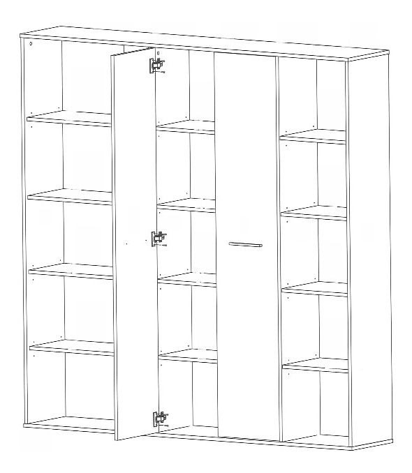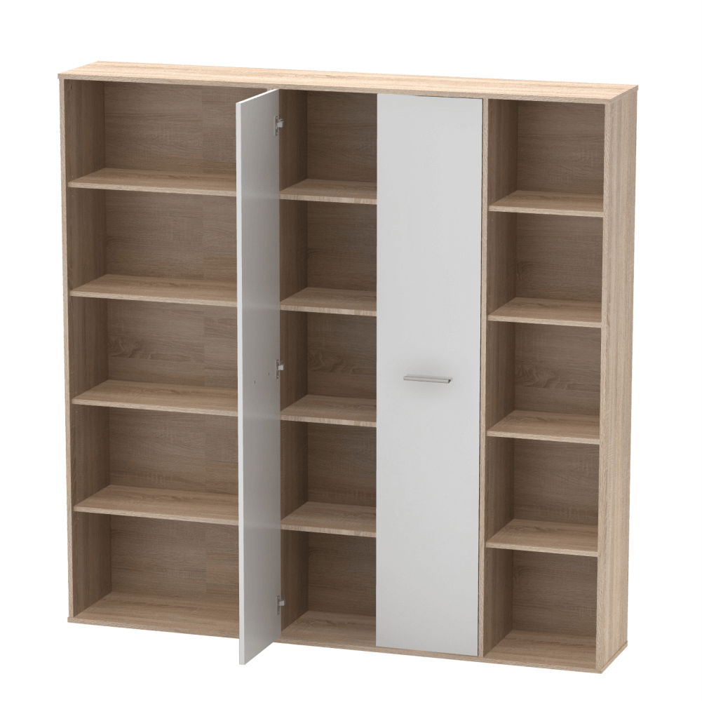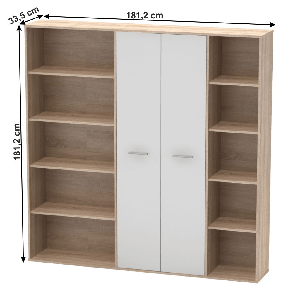 Čtyřdílná policová skříň se dvěma dvířky uprostřed a regálem s pěti poličkami po stranách. Skříň Maurus je vyrobena v odstínu dub sonoma světlý a dvířka jsou v bílé barvě. Za dvířky se nacházejí poličky.
