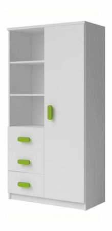 Široká policová skříň, která se vyznačuje moderním vzhledem vhodným zejména do dětských a studentských pokojů. Má tři otevřené poličky, tři zásuvky a v pravé části uzavřené police. Úchyty zásuvek a dveří jsou barevné. Barevné provedení skříně je bílá.
