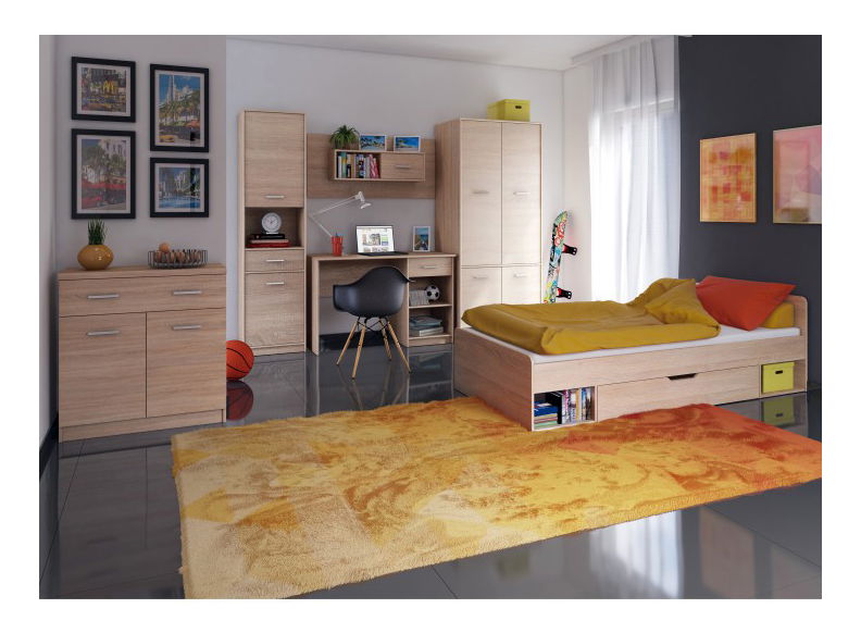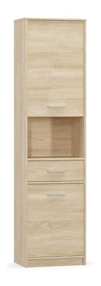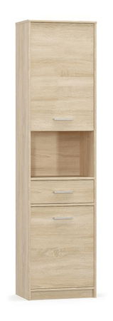 Policová skříň z modelové řady Teyo nabízí moderní design a funkční řešení, která pomohou vytvořit plnohodnotnou dětskou či studentský pokoj. Policová skříň je dostatečně vysoká. Má dvoje dvířka, otevřenou poličku a zásuvku. V horní i dolní skříňce se nacházejí poličky, které můžete využít na knížky či jiné drobnosti. Barevné provedení skříně je dub sonoma.