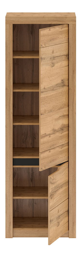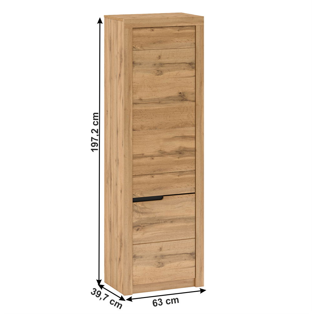 Policová skříň Toriana V2 (P) o výšce 197,2 cm a hloubce 39,7 cm je ideálním doplňkem pro Váš domov. Vyrobena je z DTD laminovaného materiálu a MDF dveří s barvou dub wotan. S jejími rozměry 63x39,7x197,2 cm a tloušťkou materiálu korpusu 16 mm a dvířek 19 mm, poskytuje dostatek prostoru pro Vaše věci. Skříň má dvoudveřový design s policemi a pravým provedením. K dispozici jsou dvě skříňky, které jsou dodávány v demontu. Využijte tuto skříň k uspořádání svých věcí a přidejte ji ke svému nábytku již dnes.