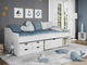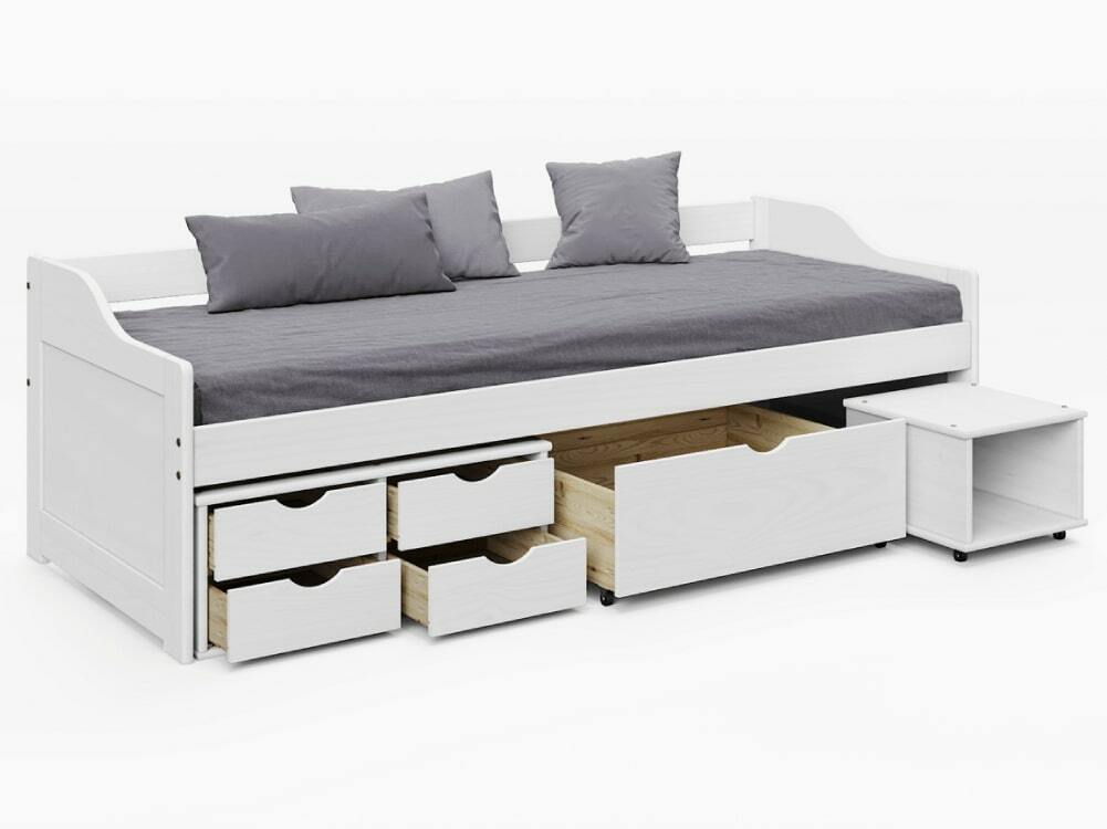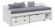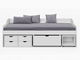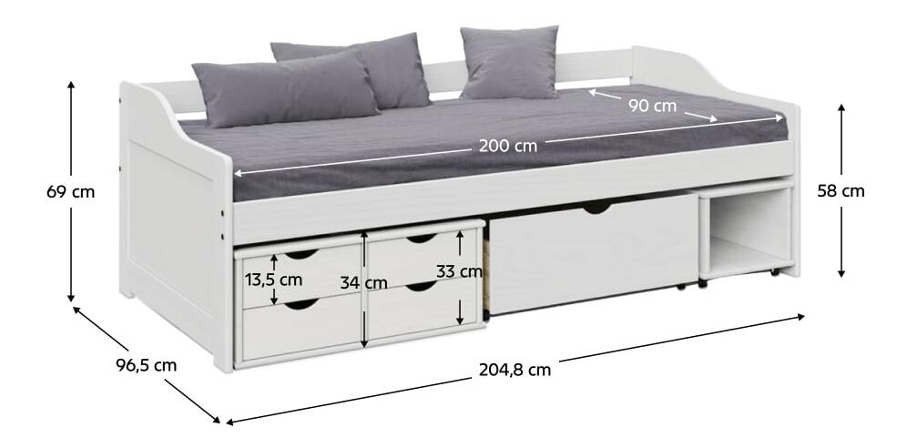 Dodáváno s laťkovým roštem, čtyři malé šuplíky, box se šuplíkem, velký šuplík, otevřený box na kolečkách, úložný prostor, dodáváno bez matrací