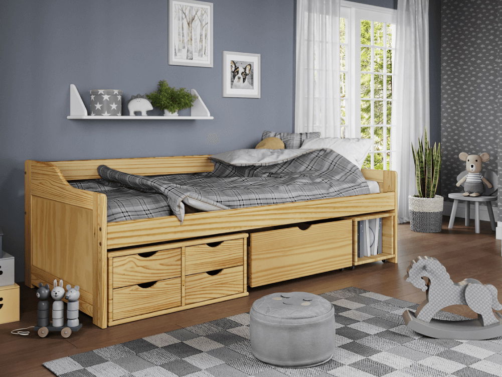 Jednolůžková postel 90 cm Marais (přírodní) je víceúčelová postel vhodná do dětského či studentského pokoje. kolečkách, který v případě potřeby může sloužit jako noční stolek Vyrobili jsme ji z kvalitního lakovaného masivu, což dodává místnosti přírodní vzhled a příjemnou vůni. Postel je dodávána s roštem, avšak matraci si můžete objednat z naší nabídky.