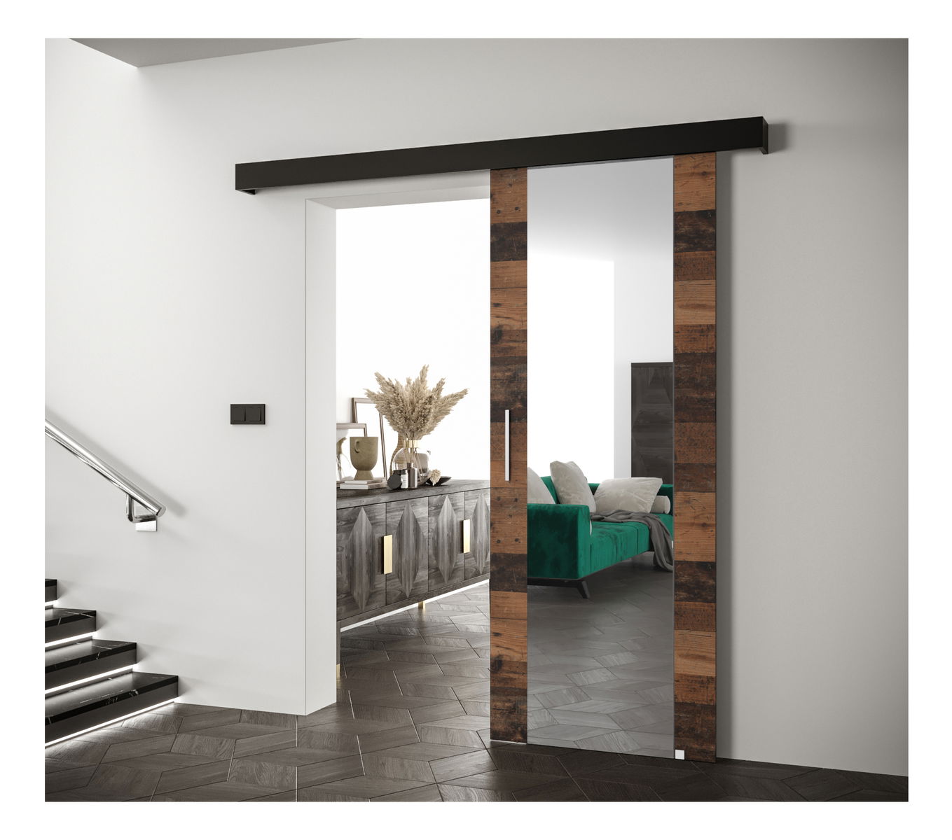 Posuvné dveře 90 cm Sharlene II (dřevo old style + černá matná + stříbrná) (se zrcadlem)