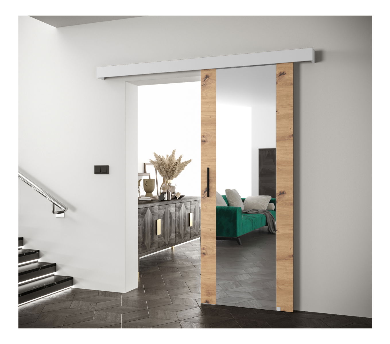Posuvné dveře 90 cm Sharlene II (dub artisan + bílá matná + černá) (se zrcadlem)