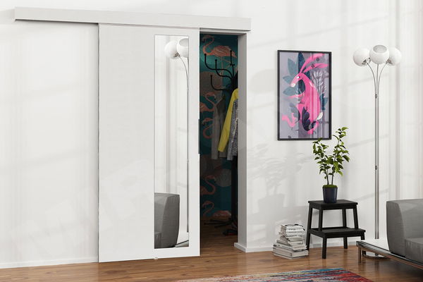 vnitřními dveřmi je uspořádání i velmi malého prostoru mnohem jednodušší. Díky posuvnému systému se již nemusíte obávat místa pro otevírání tradičních křídel – prostor si můžete libovolně uspořádat i přímo před dveřmi. Univerzální montáž na pravou nebo levou stranu umožňuje přizpůsobit nástěnné dveře vašim potřebám a dispozici místnosti. Bohatá barevná paleta vám umožní dokonale přizpůsobit posuvné dveře vašemu uspořádání. Přední strana zdobená zrcadlem má kromě dekorativní funkce i praktičtější úpravy - opticky odráží sluneční paprsky, prosvětluje místnost. Rozměry dveří přizpůsobené otvorům ve stěně do šířky 100 cm: šířka: 106 cm, výška: 205 cm