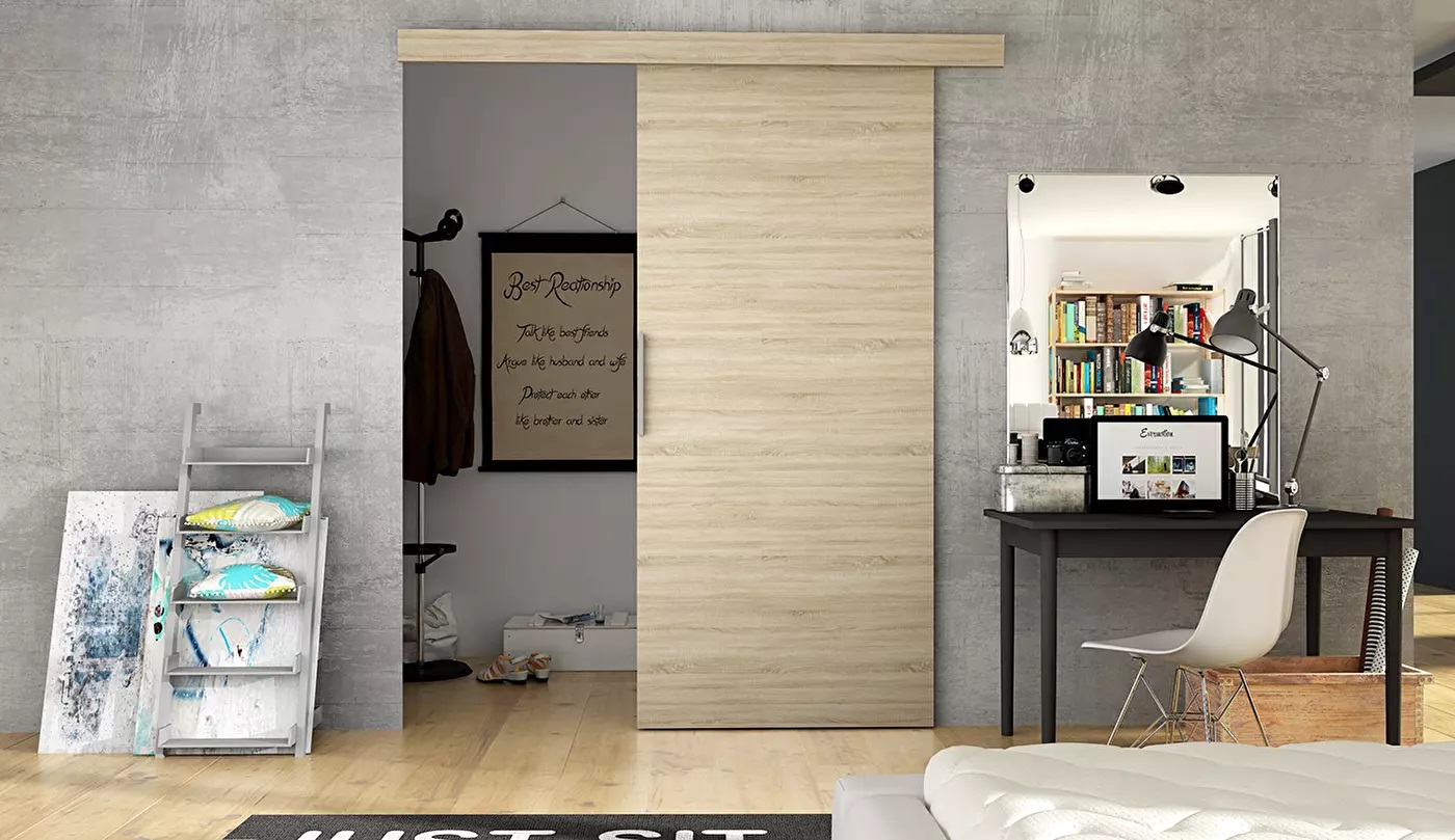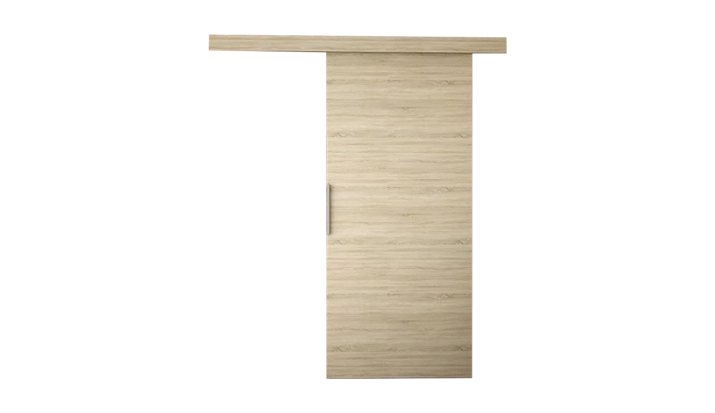 Posuvné dveře jsou dokonalým a jednoduchým řešením, které se hodí pro úsporu místa v chodbě, v ložnici, obývacím pokoji a dětském pokoji. Efektivním způsobem oddělí jednu místnost od druhé, což opticky zvětší samotný interiér. Pomocí těchto dveří můžete za nimi vytvořit efektivní a funkční šatník s mnoha policemi a tyčemi na šaty. Tento systém posuvných dveří má rozměry 86 cm x 205 cm a podélném vedení 205 cm.