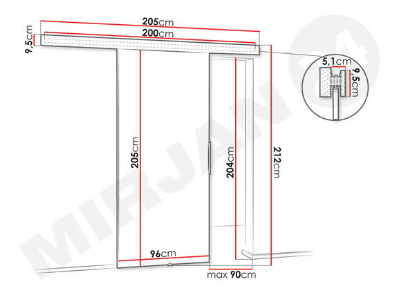 křídlo dveří se posouvá po vedení namontovaném nad otvorem dveří pod mas cm,