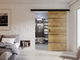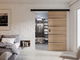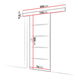 křídlo dveří se posouvá po kolejnici namontované nad otvorem dveří pod fasádou,