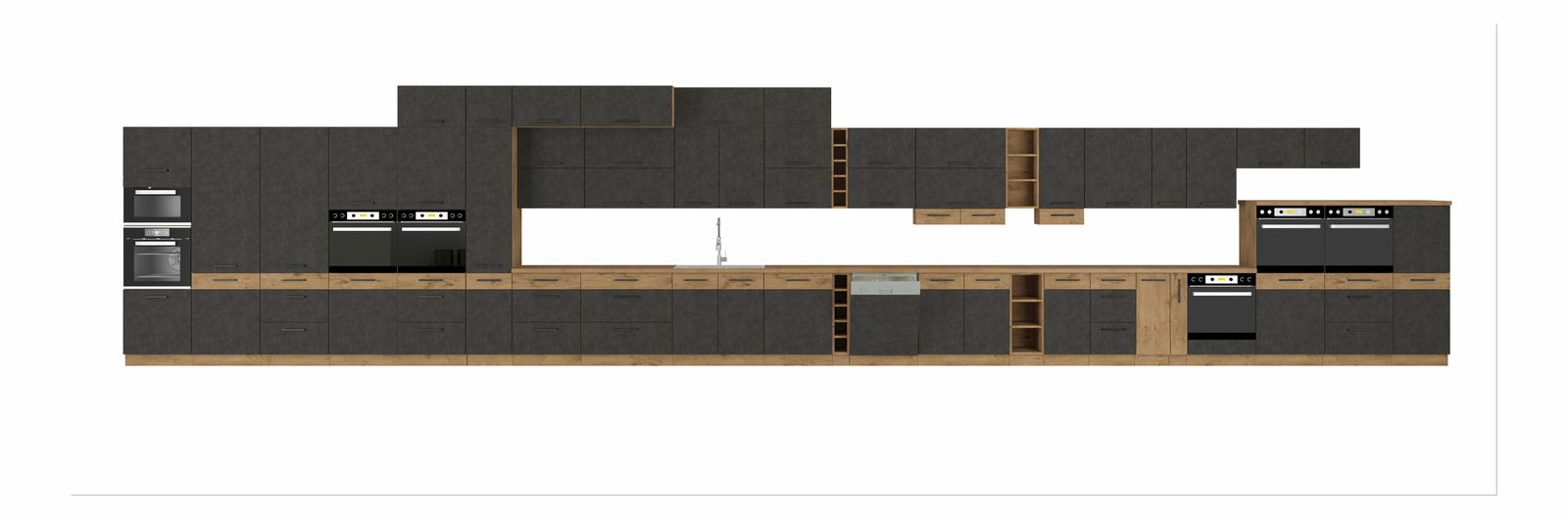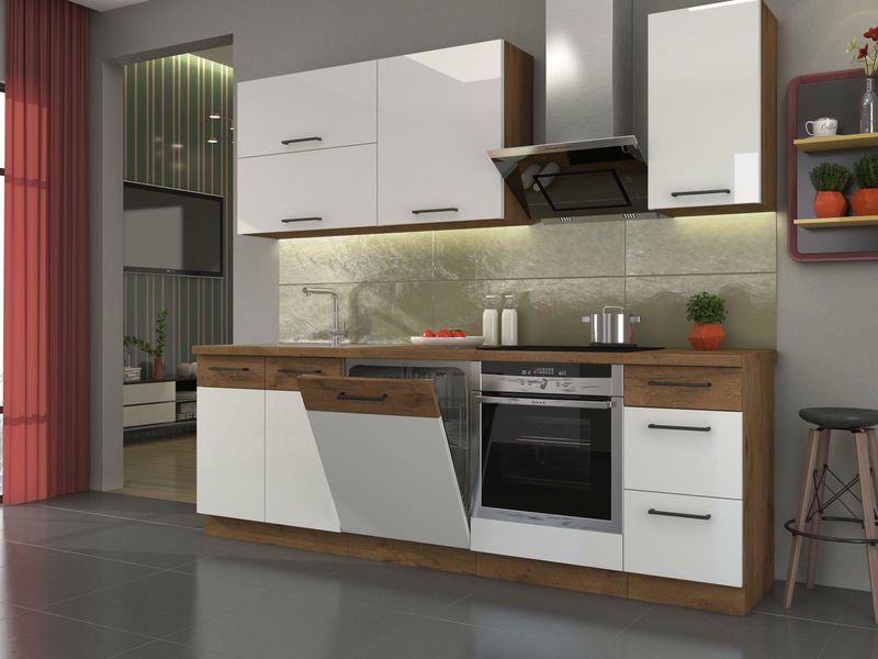 Staňte se pro tuto chvíli architektem a designér vlastní kuchyně. Nabízíme Vám směs designových skříněk v barvě bílá, šedá a bordó v kombinaci dubu Lancelot. Přáli jste si mít troubu v úrovni učí, nebo ji máte rádi v dole. Přáli jste si skříňky s výklopnými dvířky nebo klasicky doprava či doleva. Výběr je na vás a na vaší fantazii.