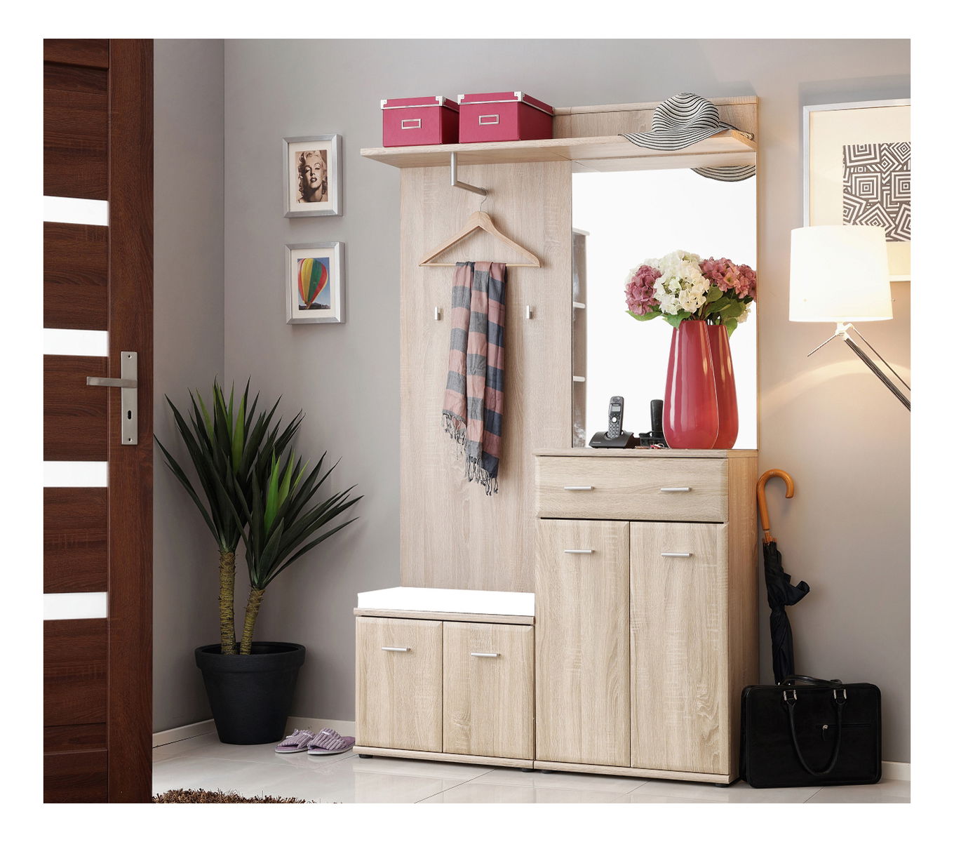 věšákový panel s policí, dolů skříňka na boty se dvěma policemi a dvířky