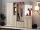 levé části úzký regál se dvěma policemi a spodní skříňkou, věšákový panel s policí, dolů skříňka na boty se dvěma policemi a dvířky