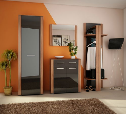 Elegance patří i do předsíně. Sestava 4 dílů předsíně je ideální skoro do každého typu místnosti nakolik je není rozměrná, ale potěší množstvím úložného prostoru. Skládá se ze skříně, zrcadla, komody (2 dvířka a jedna zásuvka) a věšákového panelu. Věšákový panel má dvě police a pod horní se nachází věšáková tyč. Barevné provedení je švestka + lesk černý.