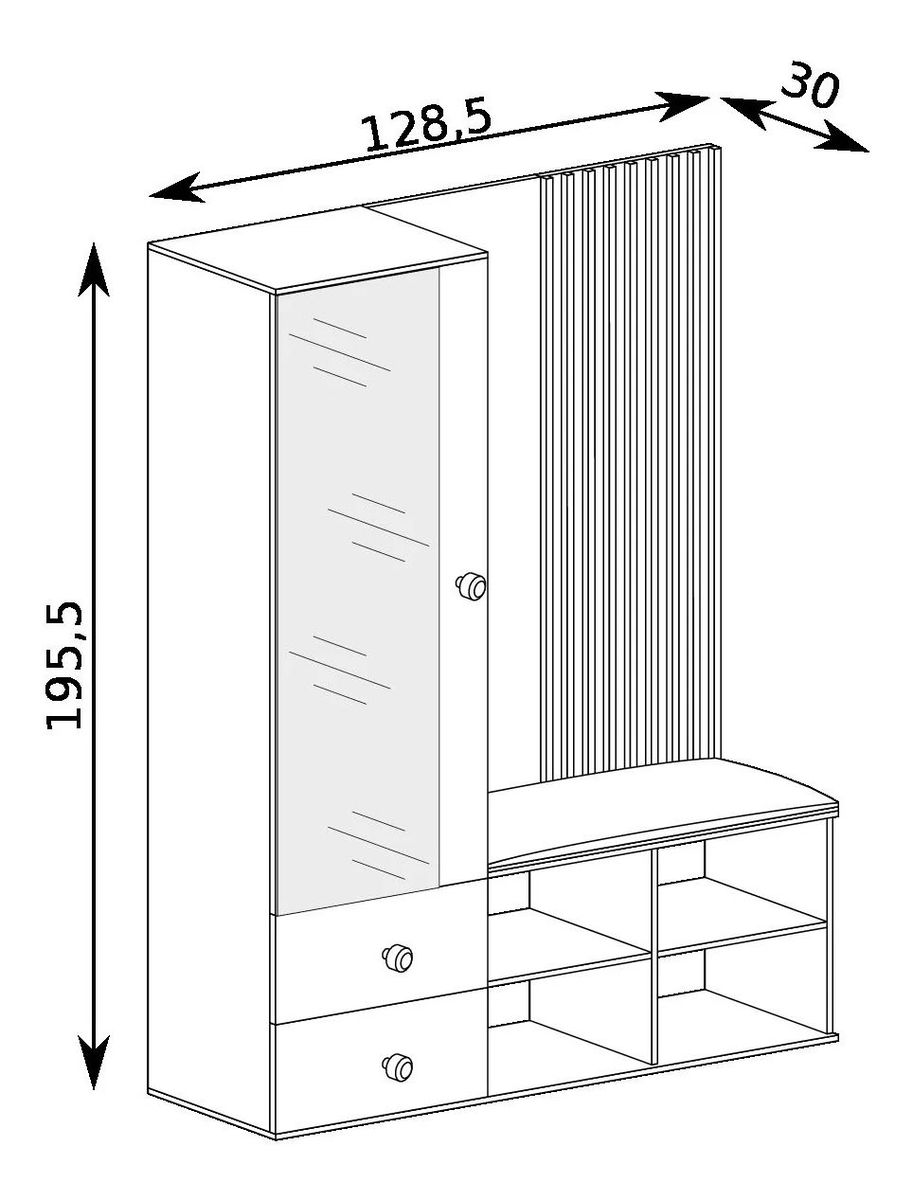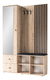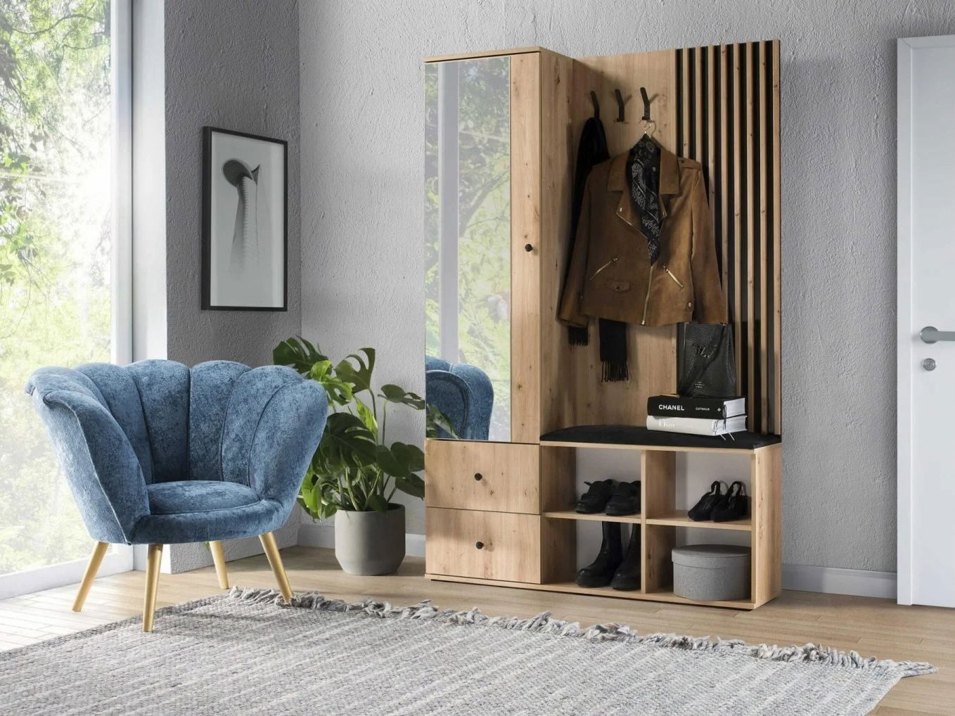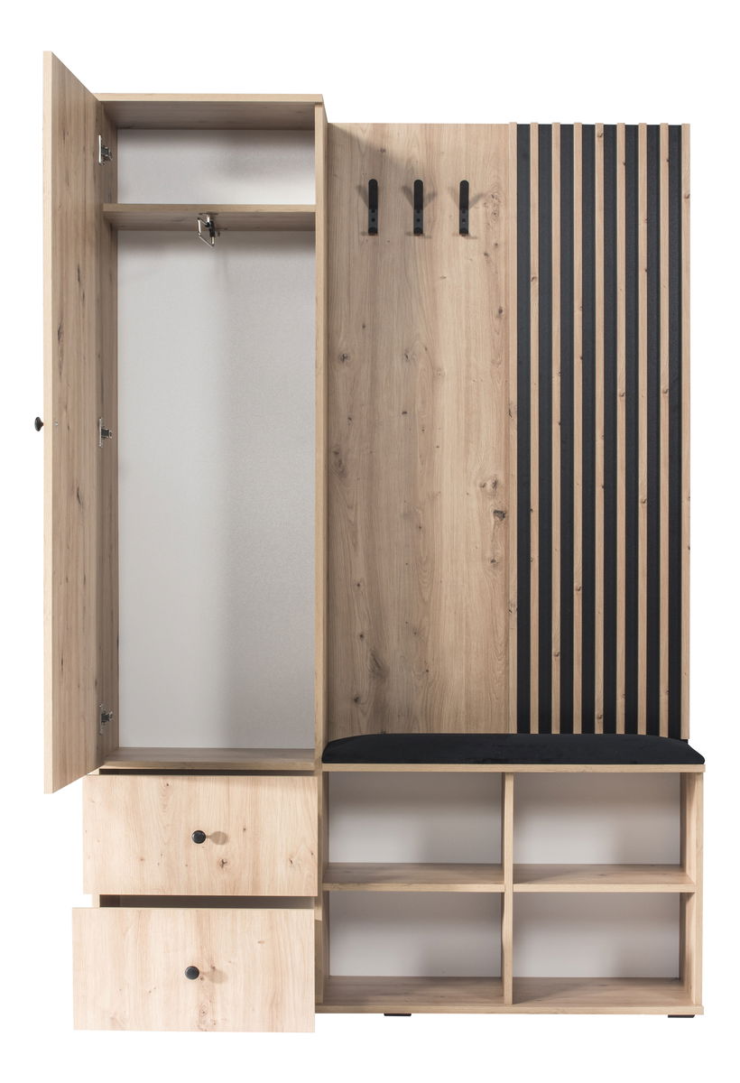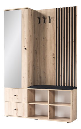 Moderní síňová sestava se zrcadlem ve světlé barvě Artisan. Dokonalá kombinace s naší novou kolekcí Claudi. Nábytek je neskutečně funkční, má pohodlné police na boty, dvě zásuvky, do kterých schováte šikovné věci jako čepice nebo rukavice. Nad skříněmi se nachází prostorná šatní skříň na věšení oblečení. Skříň má pohodlný, čalouněný sedák v černé barvě, která odpovídá podkladu, na kterém jsou lamely. Bundy či kabáty můžeme zavěsit na tři kovové věšáky, které jsou konstruovány tak, že na ně můžeme pověsit až šest šatů, každé na samostatném věšáku! Tato šatní skříň je ideálním řešením do předsíně.