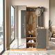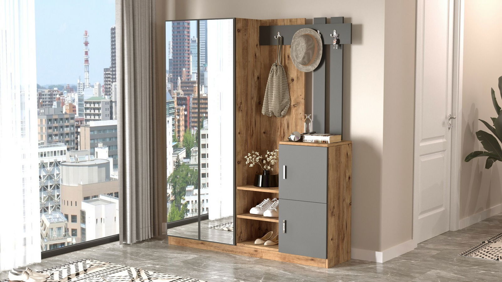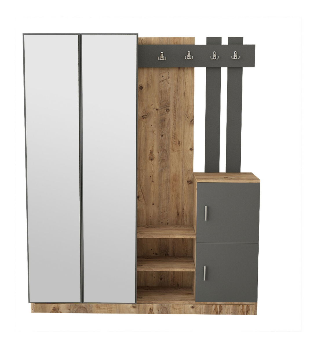 ZobrazitPředsíň - Dede 8 je moderní nábytek o výšce 179,7 cm, šířce 147,2 cm a hloubce 37,5 cm. Vyrobený z kvalitního dřeva Atlantická Borovice a vybavený elegantním antracitovým odstínem, tento produkt je ideálním doplňkem pro váš vstupní prostor. nabízí dostatek úložného prostoru pro vaši obuv, kabáty a další věci. stylový design a praktické funkce vám umožní udržet vaši předsíň čistou a dobře zorganizovanou. S tímto produktem získáte nejen funkční nábytek, ale také stylový prvek, který přinese do vašeho domova eleganci a vkus.