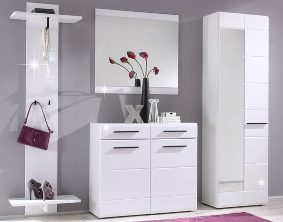 Předsíň malých rozměrů je vhodná do menších bytů. Přesto nabízí dostatek prostoru potřebného na zavěšení kabátů či uložení bot. Korpus je vyroben z fóliované DTD a fronty z MDF s extra vysokým bílým leskem HG. V šatní skříni se nachází polička v horní části. Pod ní je umístěna vysuvná věšáková tyč.