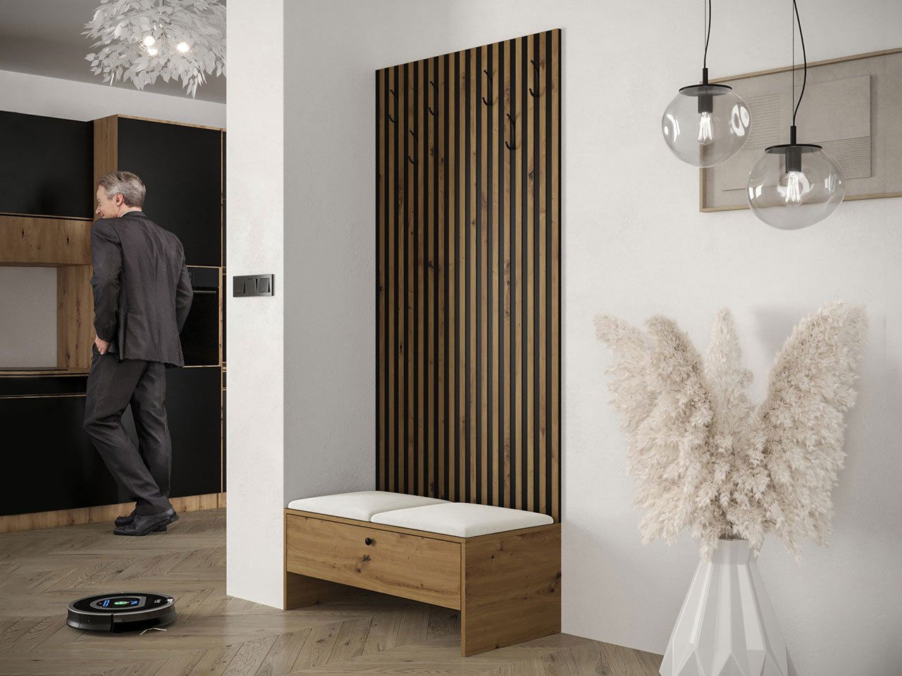 ZobrazitElara IV se postará o stylový design předsíně. Kombinace skříňky na boty se sedadlem a panelu s věšáky zvyšuje funkčnost celé místnosti. Upravuje vstup do bytu a podporuje harmonii a módní vzhled. Panel zdobený lamelami poskytuje prostor pro zavěšení kabátů a bund. Háčky, které jsou k němu připevněny, ladí se stylem díky své tmavé barvě. Nenápadně organizují skladování svrchního oblečení.