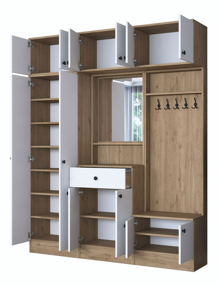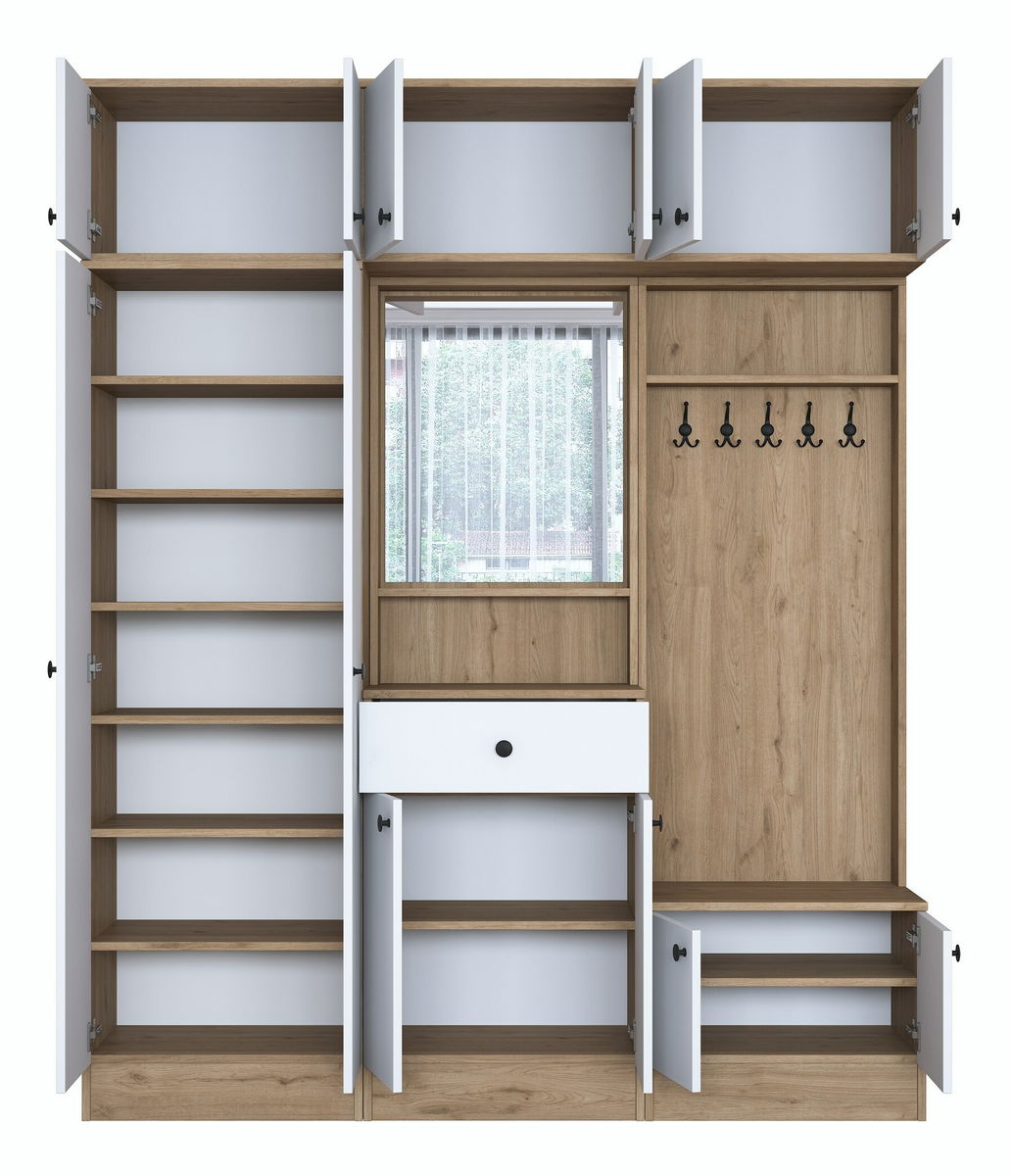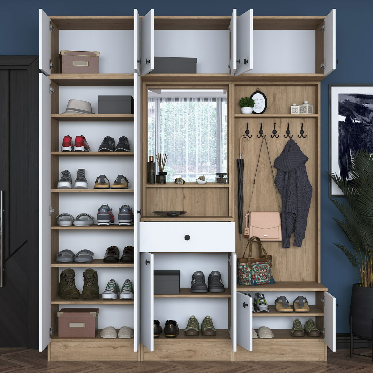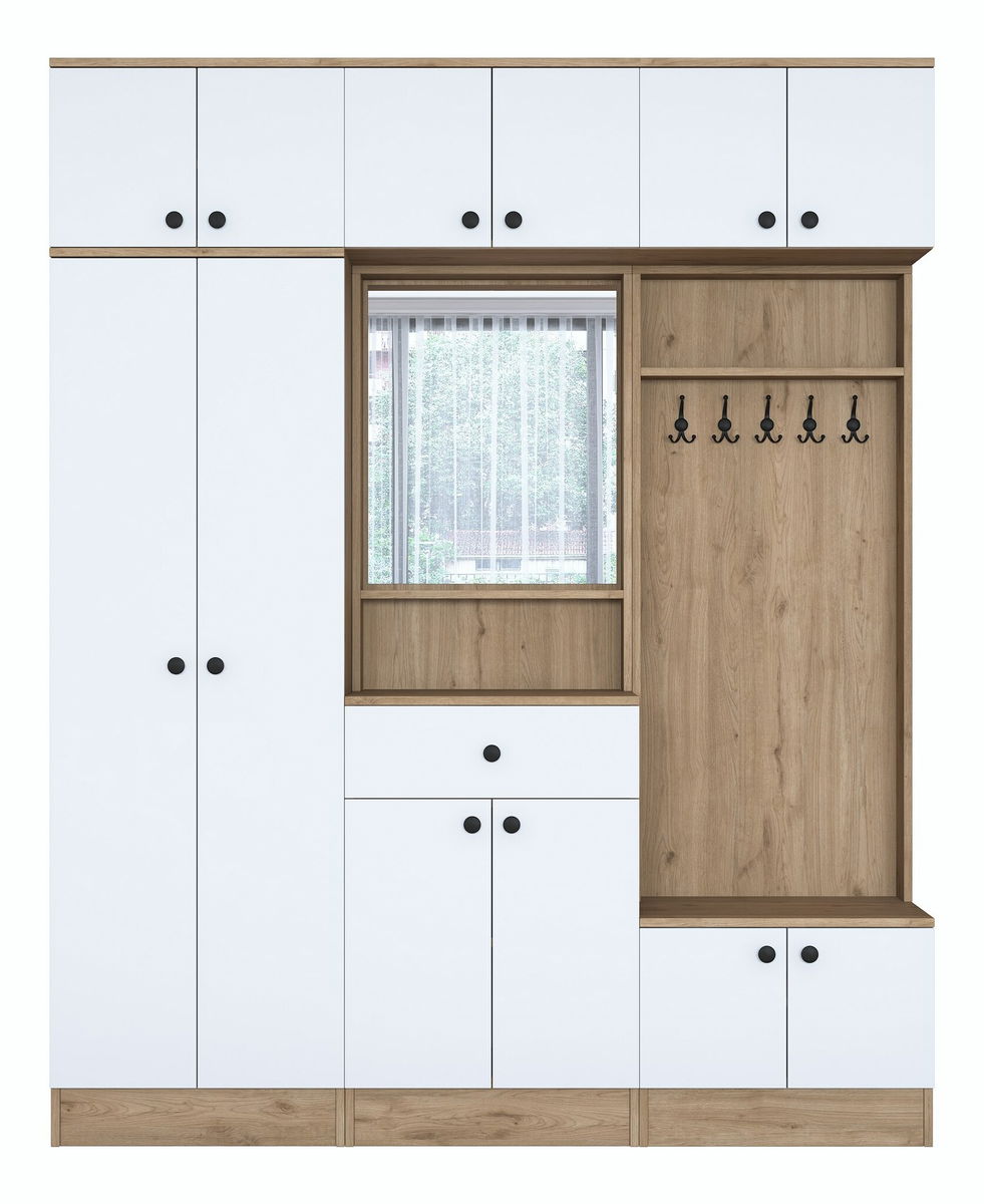 Předsíňová sestava - Emily (Ořech + Bílá) je elegantní a praktická řešení pro vaši předsíň. S výškou 226.4 cm, šířkou 179.6 cm a hloubkou 37.5 cm poskytuje dostatek úložného prostoru pro vaše věci. Sestava kombinuje moderní design s kvalitními materiály, jako je ořechový a bílý nábytek, což přináší do vaší předsíně stylový vzhled. S různými úložnými prostory pro boty, kabáty a další doplňky, tato sestava vám pomůže udržet vaši předsíň uklizenou a organizovanou. Emily sestava je ideálním doplňkem pro každého, kdo upřednostňuje funkčnost a estetiku ve svém domově.