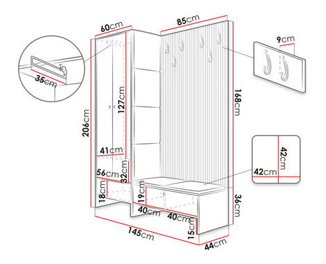 ZobrazitPředsíň je ideální volbou pro ty, kteří hledají pohodlí a styl. Moderní šatník Esmoltis III je zodpovědný za funkčnost síně. Pořádá úložný prostor, poskytuje místo pro každodenní oblečení a navíc zkrášluje interiér. Za výrazný vzhled nábytku je zodpovědná kombinace nejmodernějších barev. Vzor imitace dřeva doplňují tmavé vložky a čalouněné panely. Kostky jsou k dispozici v mnoha módních barvách a jsou útulnou dekorací při vstupu do domu. Zvyšují také pohodlí sedáku při přezouvání. Součástí je i prostorná dvoudveřová šatní skříň. Dodatečná montáž vnější zásuvky usnadňuje ukládání kabátů a bund, jakož i příslušenství. Rozměry: Šatník Esmoltis: šířka: 60 cm, výška: 206 cm, hloubka: 44 cm, Lamelová stěna Esmoltis: šířka: 85 cm, výška: 206 cm, hloubka: 44 cm, Čalouněný panel PAG 42x42: x6 šířka: 42 cm, výška: nábytku: přední část a tělo: 16 mm silná laminovaná deska, hrany jsou zakončeny odolnou PVC dýhou odolnou vůči poškození, zadní část nábytku z HDF desky, kovové rukojeti, věšáky obsahují 6 plastových dvojitých háčků, prvky spojené pomocí excentrických spojek z plastu materiál: podklad panelu tvoří 8 mm silná deska + 3 cm silná pěna T18 + tkanina, tvar: čtvercový, 3D efekt, chrání stěny před poškozením, zvukotěsnost, použití: pro interiér, panely ideální pro povrchovou úpravu stěn Záruka: 24 měsíců