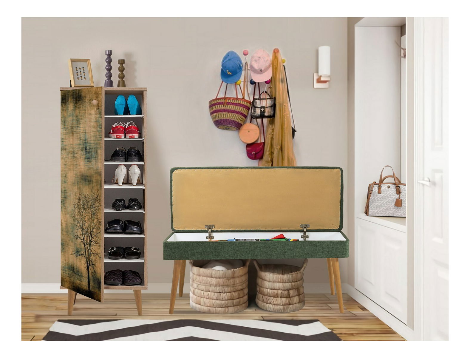 tloušťka: 18 mm, dřevěné nohy, botová skříňka: šířka: 50 cm, výška: 135 cm, hloubka: 38 cm, (1 kus) velikost lavice: šířka: 105 cm, výška: 50 cm, hloubka: 40 cm