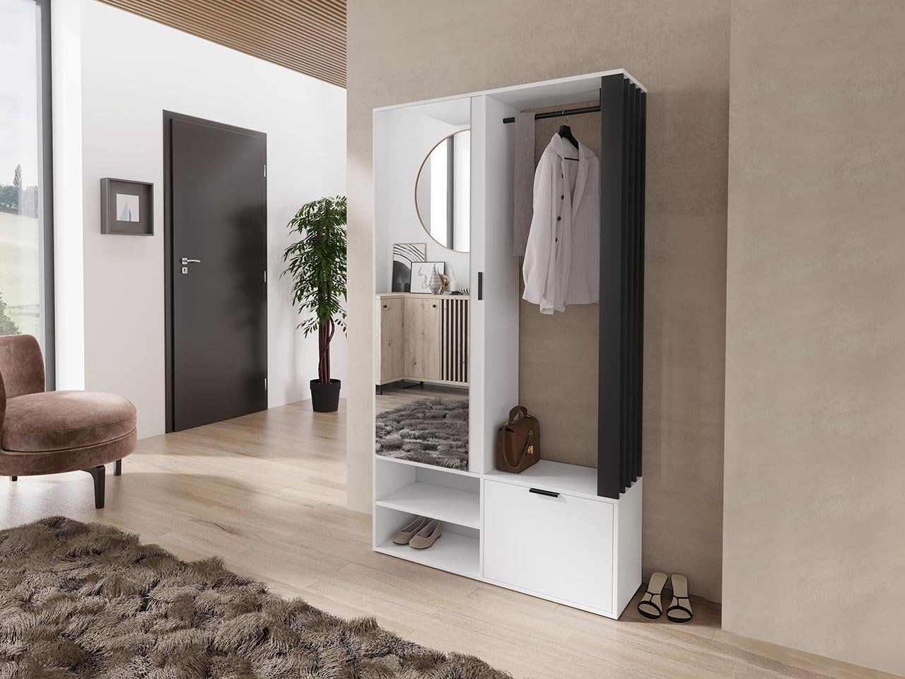 ZobrazitChodba nás vítá při vstupu do domu a před odchodem se s námi loučí. Proto se vyplatí vybavit ji funkčním nábytkem. Šatník je právě takový praktický model. Co nám nabízí? Tyč na svrchní oblečení, šatník s policemi a zrcadlem na přední straně. Díky tomuto uspořádání si před odchodem z domova roztřídíte své každodenní věci a zkontrolujete svůj vzhled. Šatník je univerzální typ. Ve fázi montáže se rozhodnete, na které straně bude skříň stát.