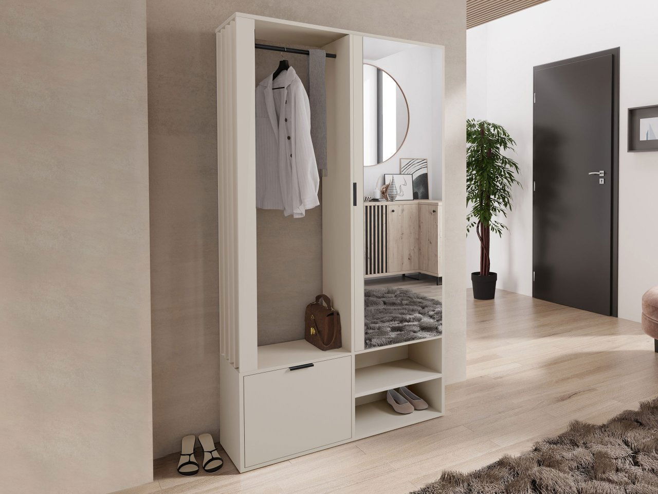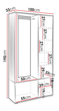 ZobrazitPředsíň je ideální volbou pro ty, kteří hledají pohodlí a styl. Chodba nás vítá při vstupu do domu a před odchodem se s námi loučí. Proto se vyplatí vybavit ji funkčním nábytkem. Šatník Frelio je právě takový praktický model. Co nám nabízí? Tyč na svrchní oblečení, šatník s policemi a zrcadlem na přední straně. Díky tomuto uspořádání si před odchodem z domova roztřídíte své každodenní věci a zkontrolujete svůj vzhled. Šatník je univerzální typ. Ve fázi montáže se rozhodnete, na které straně bude skříň stát. Rozměry: šířka: 100 cm, výška: 190 cm, hloubka: 33 cm Provedení: 16 mm silná laminovaná deska, lemování z PVC, rukojeti: černý hladký zamak, nožičky: plastové nožičky v černé barvě, zrcadlo na přední straně, šatní skříň je montáž na které straně otevřenou tyč na šaty Záruka: 24 měsíců