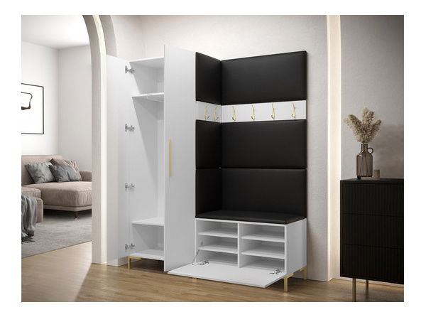 ZobrazitPředsíňová sestava je ideální volbou pro ty, kteří hledají pohodlí a styl. V každé domácnosti je důležitý řád, dobrou organizaci vnějších doplňků na prahu bytu zajistí sestava do předsíně Frunofta I . Sestavu tvoří dvoudveřová šatní skříň, do které se úspěšně vejde sezónní svrchní oblečení. Dodatečné police uvnitř budou ideální pro uložení čepic, rukavic nebo zimních šál. Skříňka na boty se vyznačuje šesti prostornými přihrádkami, díky kterým boty získají jedno specifické úložné místo. Celek je uzavřen do elegantní formy, přidání čalouněných panelů zlepšuje komfort každodenního používání předsíně se sedákem. Možnost výběru z několika předních povrchů a barev čalouněných panelů navíc dodá nábytku individuální a mimořádný charakter. Rozměry: Šatník Frunofta: šířka: 74 cm, výška: 196 cm, hloubka: 46 cm, Skříň na boty Frunofta: šířka: 84 cm, výška: 52 cm, hloubka: 46 cm, Frunofta věšák na šaty 84 Frunofta: oblečení, šířka: 4 Frunofta: šířka: 41 cm, výška: 16 cm, Čalouněný panel Pag 42x42: x3 šířka: 42 cm, výška: 42 cm, hloubka: 4 cm, Čalouněný panel Pag 84x42: x4 šířka: 84 cm, výška: 42 cm, hloubka: 1 laminovaná deska, zadní strana nábytku: HDF deska, hrany jsou upraveny odolnou a každodennímu používání odolnou 0,5 mm PVC dýhou, úchyty a nožičky: plastové ve zlaté (bílý a černý nábytek) nebo černé barvě (nábytek v barvě dub craft), rovné závěsy, věšáky obsahují věšáky 8 mm silná deska + 3 cm silná pěna T18 + látka, tvar: čtverec/obdélník, 3D efekt, chrání stěny před poškozením, pohlcování zvuku, použití: pro interiér, panely ideální pro povrchovou úpravu stěn Záruka: 24 měsíců