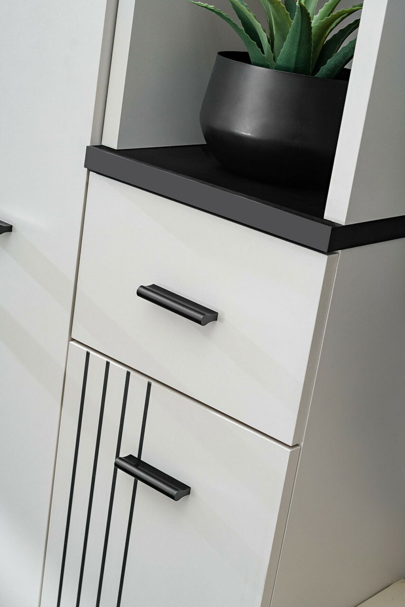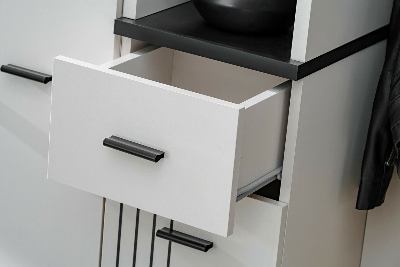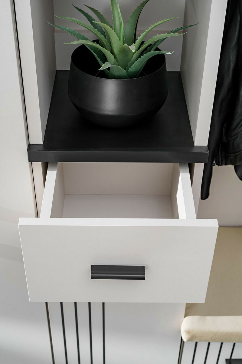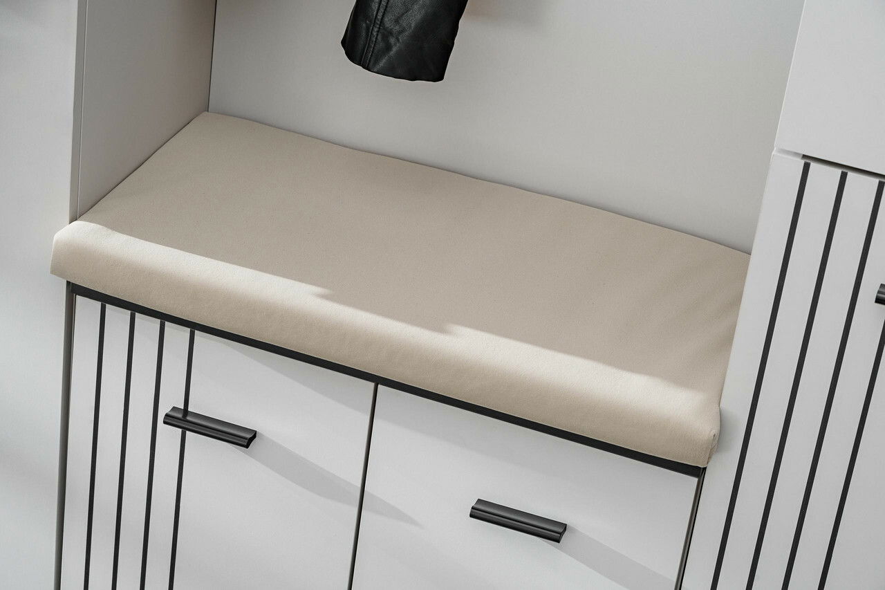 Vytvořte si dobře organizovaný a stylový vstupní prostor s předsíní Hagon v moderním provedení kašmír s černými detaily, moderní vzhled podtrhuje dekorativní potisk pruhů, který spojuje funkčnost s vizuální elegancí. Objevte předsíňové skříňky, které nabízejí více než jen první dojem. Díky promyšlenému vnitřnímu členění získáte bohatý úložný prostor na boty, doplňky, tašky nebo sezónní oblečení. Otevřené police, zásuvka a skříňky s dvířky vám umožní udržovat pořádek a mít vše po ruce, ale zároveň elegantně skryté před zraky návštěv. Ideální řešení pro ty, kteří chtějí, aby jejich předsíň působila upraveně a stylově. Věšákový panel s horní policí, pod kterou se nachází věšák – ideální pro odkládání kabátů a bund. Na stěně navíc najdete 2 samostatné věšáky, které poskytují praktický prostor pro každodenní použití. Poznámka: předsíň obsahuje podsedák.