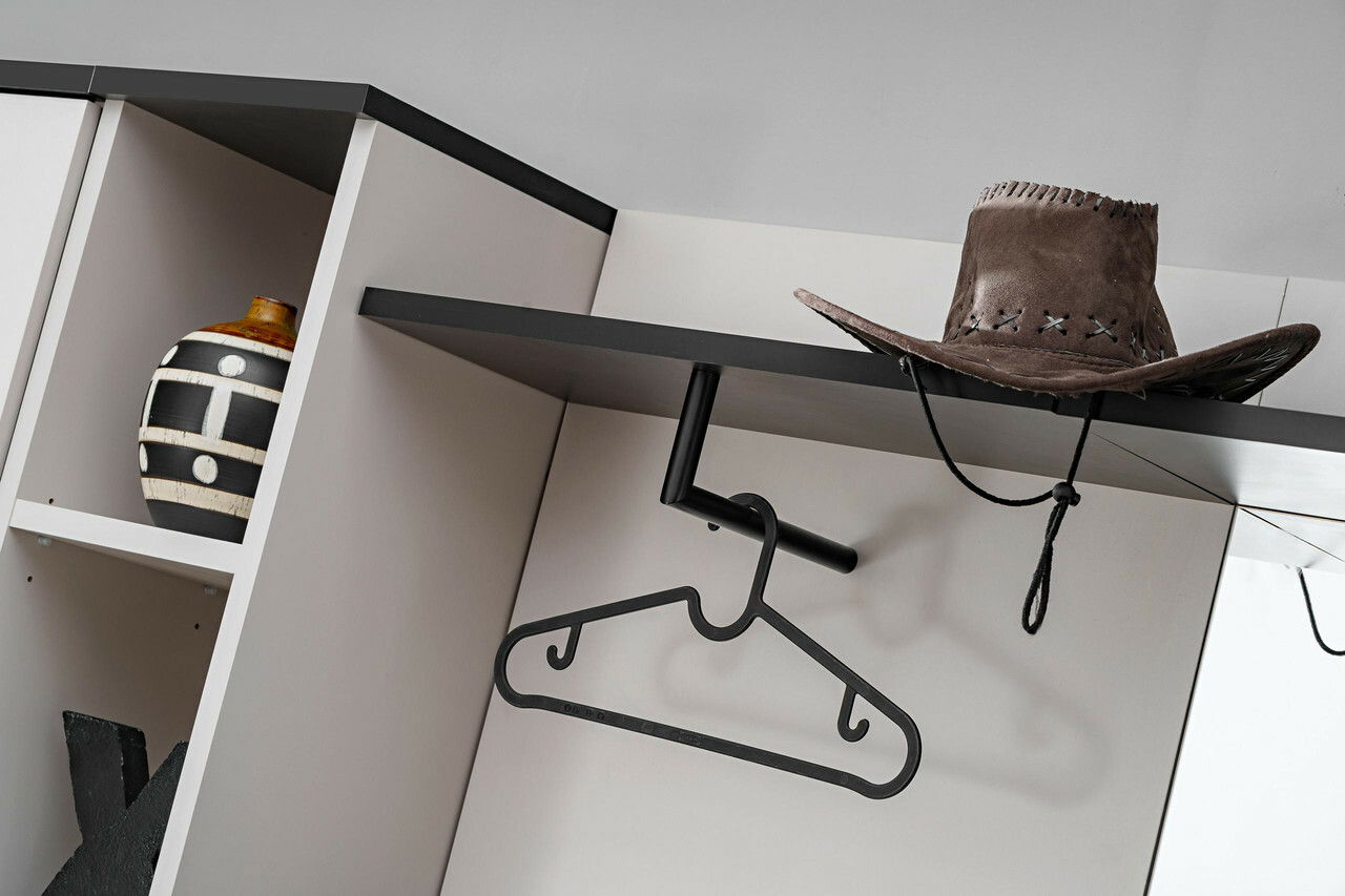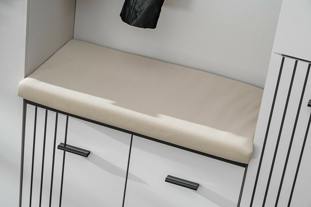 Vytvořte si dobře organizovaný a stylový vstupní prostor s předsíní Hagon v moderním provedení kašmír s černými detaily, moderní vzhled podtrhuje dekorativní potisk pruhů, který spojuje funkčnost s vizuální elegancí. Objevte předsíňové skříňky, které nabízejí více než jen první dojem. Díky promyšlenému vnitřnímu uspořádání získáte bohatý úložný prostor na boty, doplňky, tašky nebo sezónní oblečení. Zásuvka a skříňky s dvířky vám umožní udržovat pořádek a mít vše po ruce, ale zároveň elegantně skryté před zraky návštěv. Ideální řešení pro ty, kteří chtějí, aby jejich předsíň působila upraveně a stylově. Věšákový panel s horní policí, pod kterou se nachází věšák – ideální pro odkládání kabátů a bund. Na stěně navíc najdete 2 samostatné věšáky, které poskytují praktický prostor pro každodenní použití. Sadu efektivně doplňuje panel se zrcadlem a horní policí. Poznámka: předsíň obsahuje podsedák.